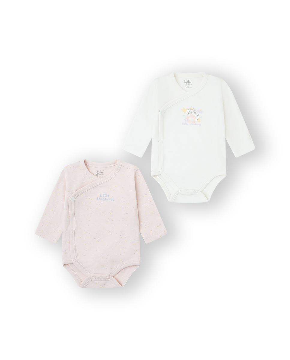 Pack de 2 bodies cruzados de manga comprida em algodão macio (não cardados): um rosa clarinho com pintinhas douradas e lettering “little treasures”, outro marfim com gatinho “little dreamer”.