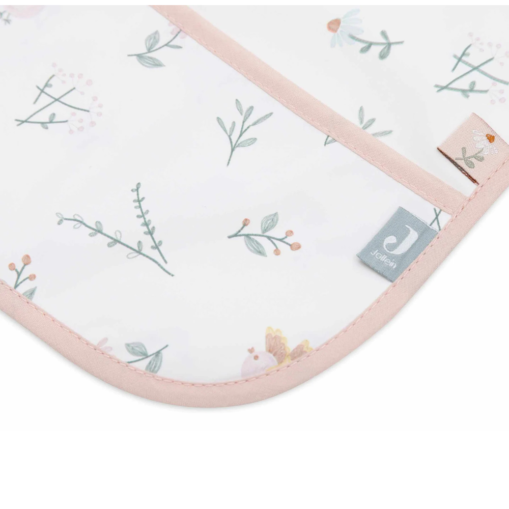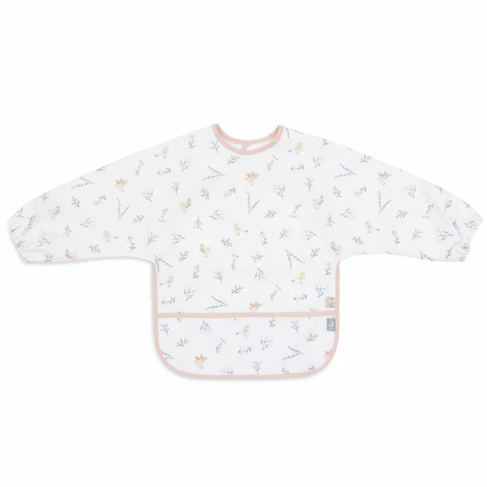 Este babete com mangas é ótimo! Este pequeno avental protege muito bem a roupa do bebé ou da criança, graças às mangas práticas. Já reparou na dupla camada de tecido na parte de baixo? Foi propositado! Quando o bebé come sozinho, a comida escorre muitas vezes pelo queixo; a borda inferior do babete funciona como tabuleiro recolhedor, evitando sujidade extra — vai agradecer! Não é só prático nas refeições: é perfeito para trabalhos manuais e pintura com os dedos. No adorável tema Lovely Birds, fica ainda mais querido, decorado com raminhos e passarinhos, e com um emblema extra com flor.