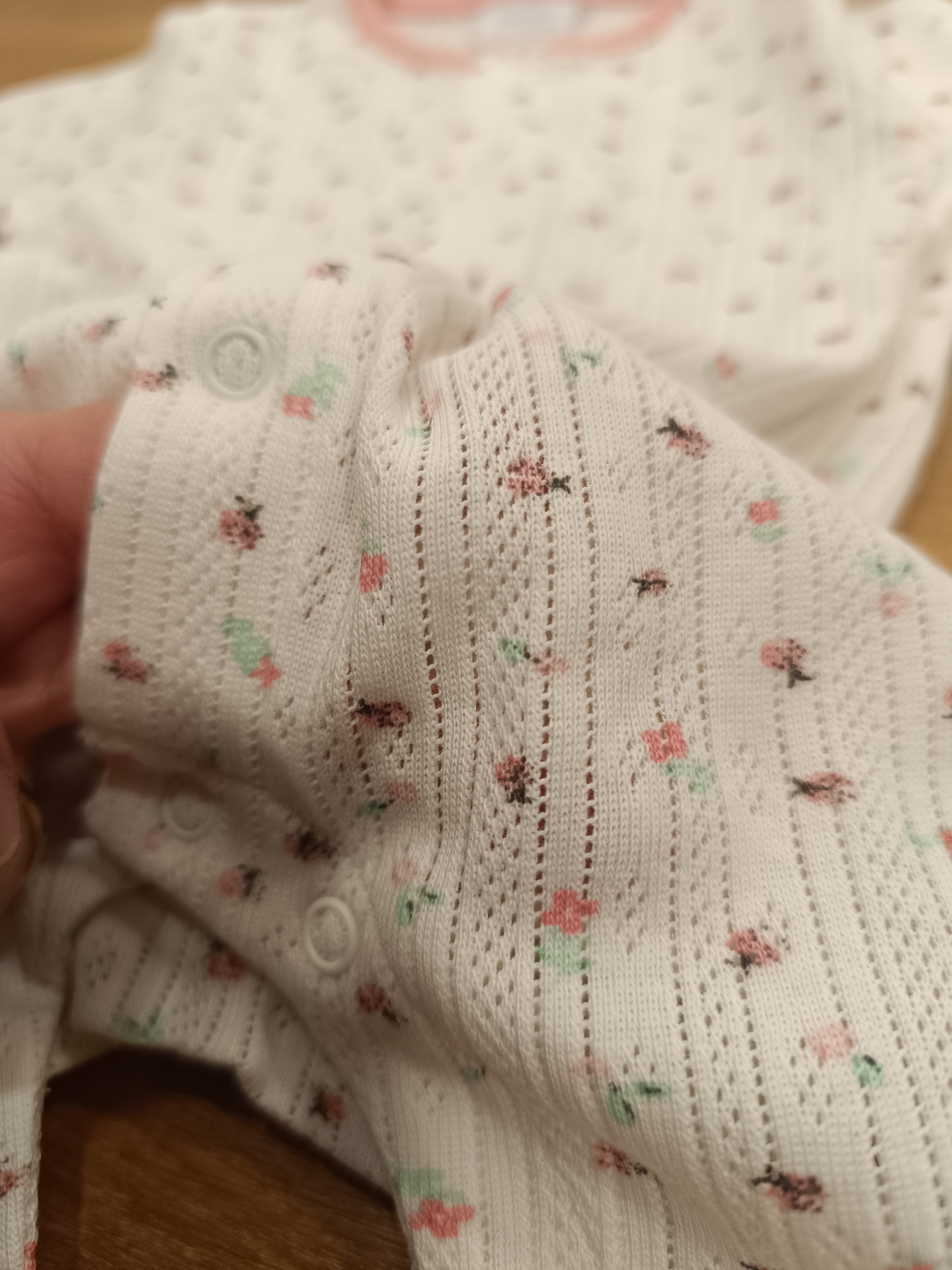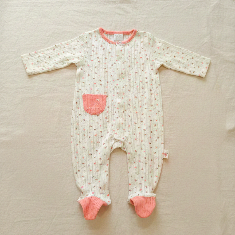 Babygrow de bebé em algodão macio, com padrão delicado em tons suaves e detalhes em rosa. Confortável e respirável, ideal para o dia a dia e para noites tranquilas. Com abertura prática com molas para facilitar a muda da fralda.