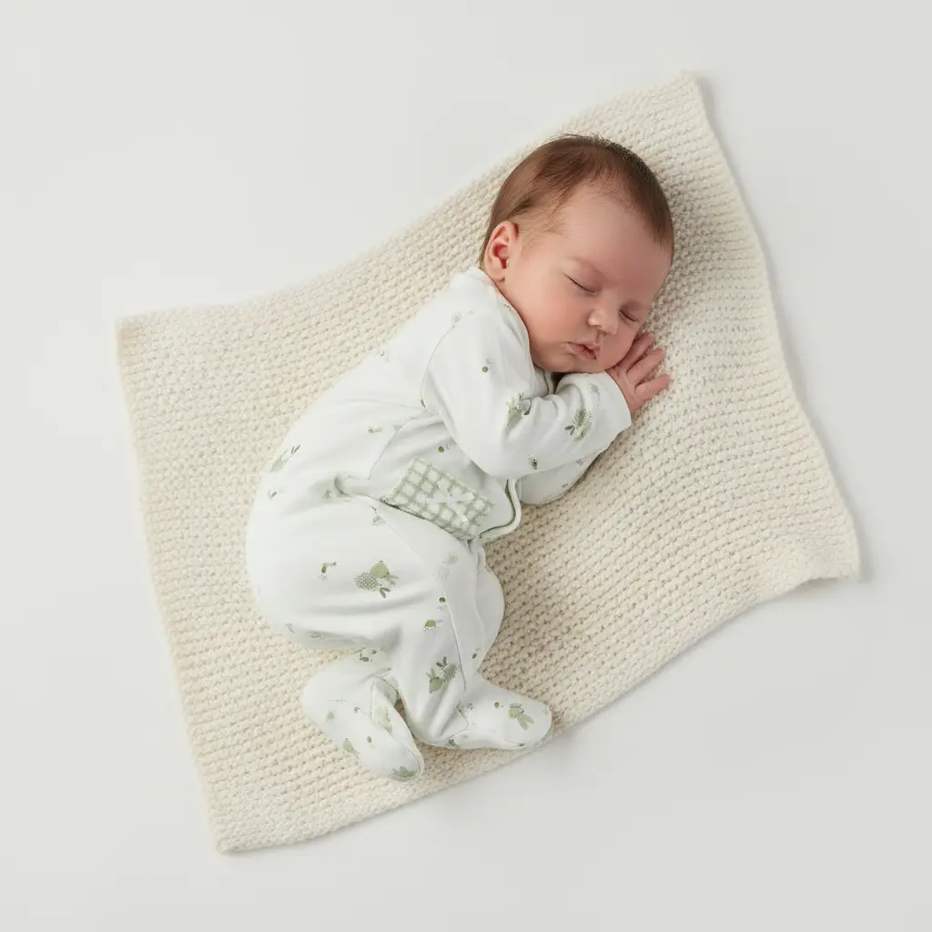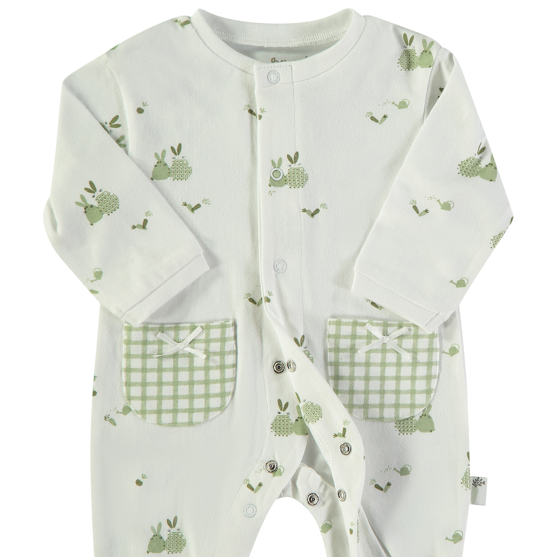 Babygrow branco com estampado delicado em tons de verde e dois bolsos à frente em padrão xadrez. Abertura com botões de pressão para vestir e mudar a fralda com facilidade.