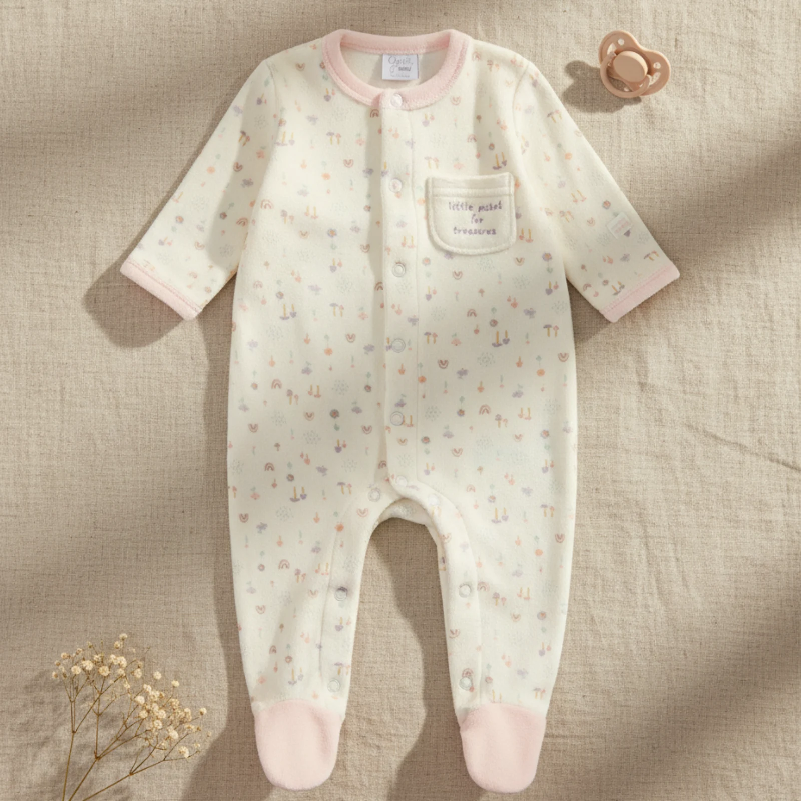 Pijama de bebé creme com estampado e detalhes cor-de-rosa e bolso com texto