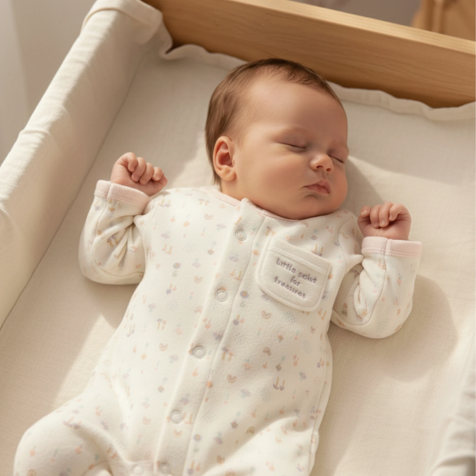 Tem abertura frontal completa com molas – prática para vestir e mudar – e um bolsinho aplicado com a mensagem “little pocket for treasures”. Os pézinhos fechados mantêm a bebé confortável de dia e de noite.