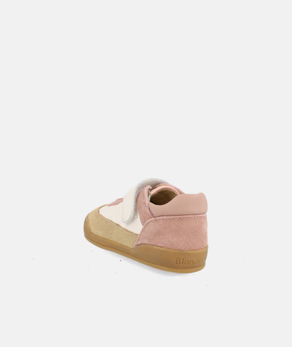 Sapato infantil em camurça rosa, bege e branco com sola castanha