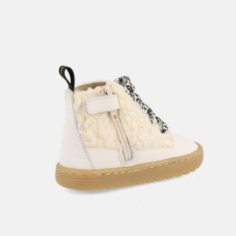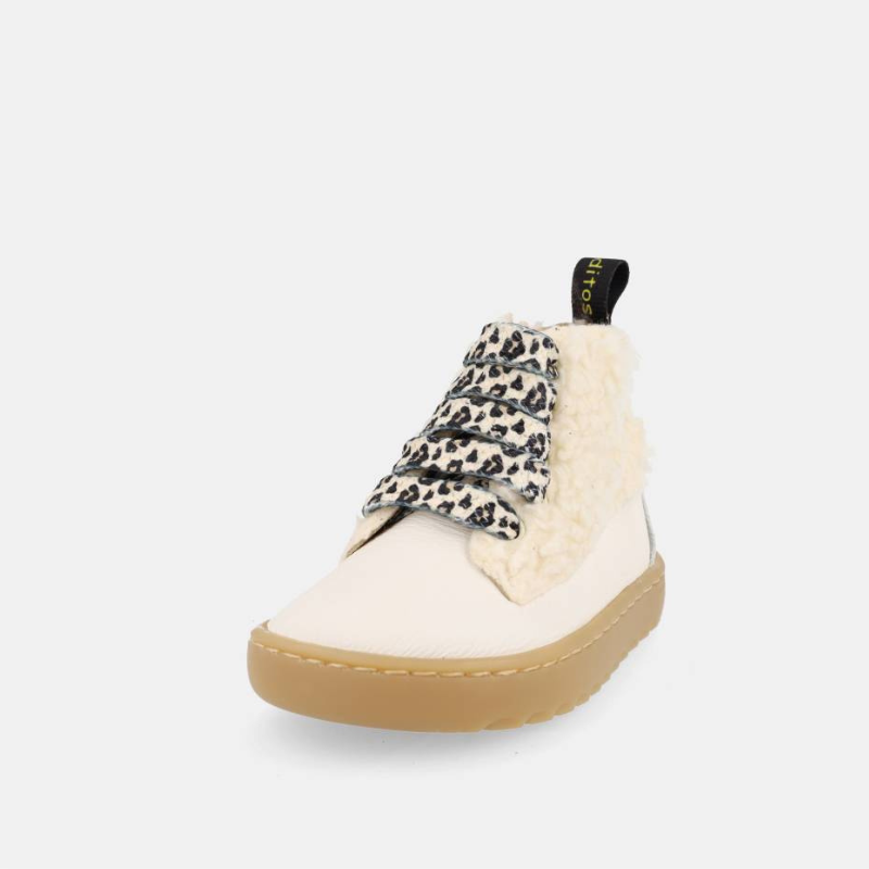 O pormenor em pelo creme e os atacadores com padrão dão um toque divertido e moderno, fácil de combinar com vestidos, jardineiras ou calças. O fecho lateral ajuda a calçar num instante (os atacadores podem ficar ajustados à medida do pé), perfeito para o dia-a-dia apressado das famílias.
