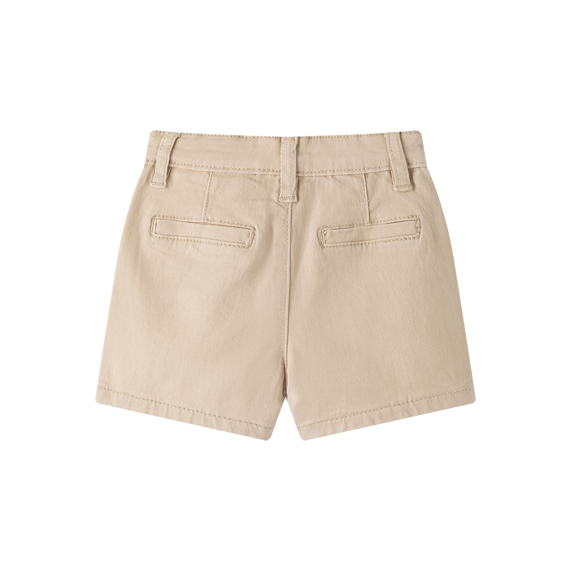 Calções de bebé em tom bege, em sarja (estilo chino), com um corte simples e fácil de combinar. Têm bolsos à frente, presilhas para cinto e fecho com botão — um básico perfeito para um look mais arranjadinho ou casual, conforme o topo.