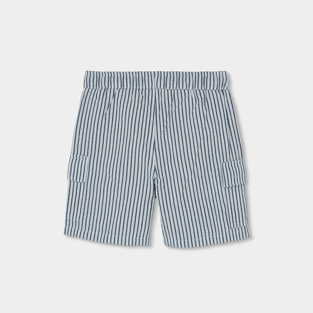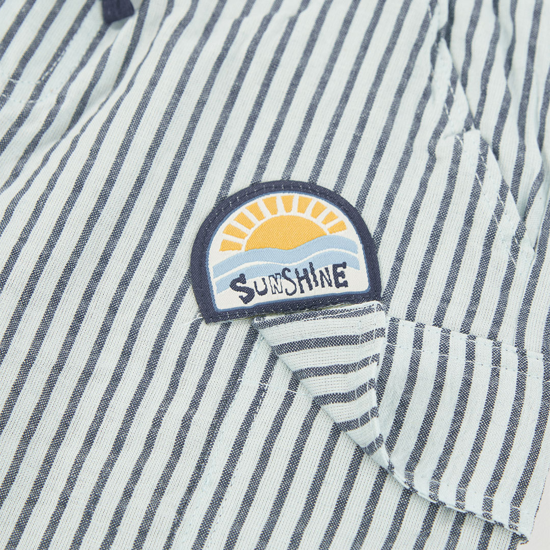 Calções de verão às riscas (azul e branco), com um estilo náutico super giro. Têm cintura elástica com cordão para ajustar facilmente e bolsos tipo cargo nas laterais, perfeitos para os pequenos exploradores. Os patches “Sunshine” e o detalhe surf dão aquele toque divertido.