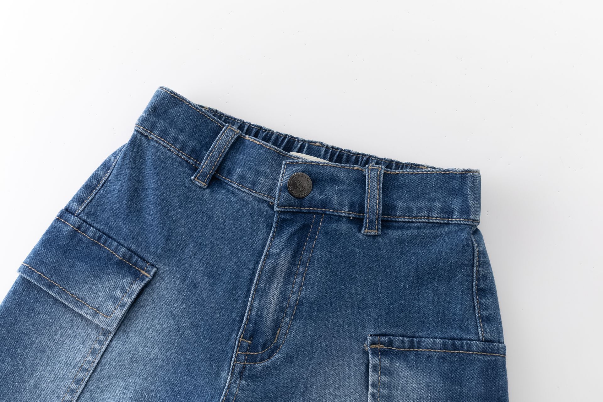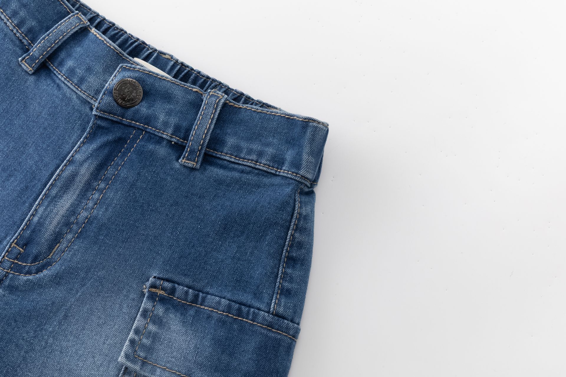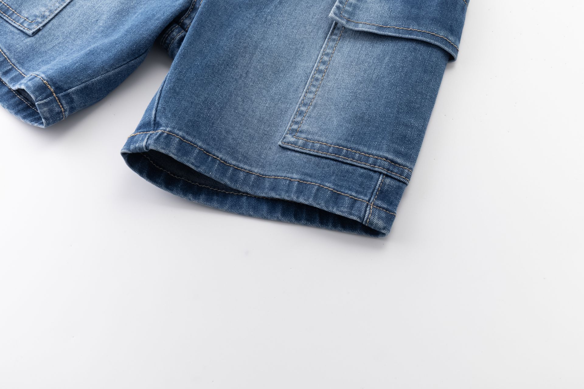 Calções de ganga para menino em azul médio, com inspiração cargo e bolsos laterais grandes — perfeitos para um look descontraído e funcional.