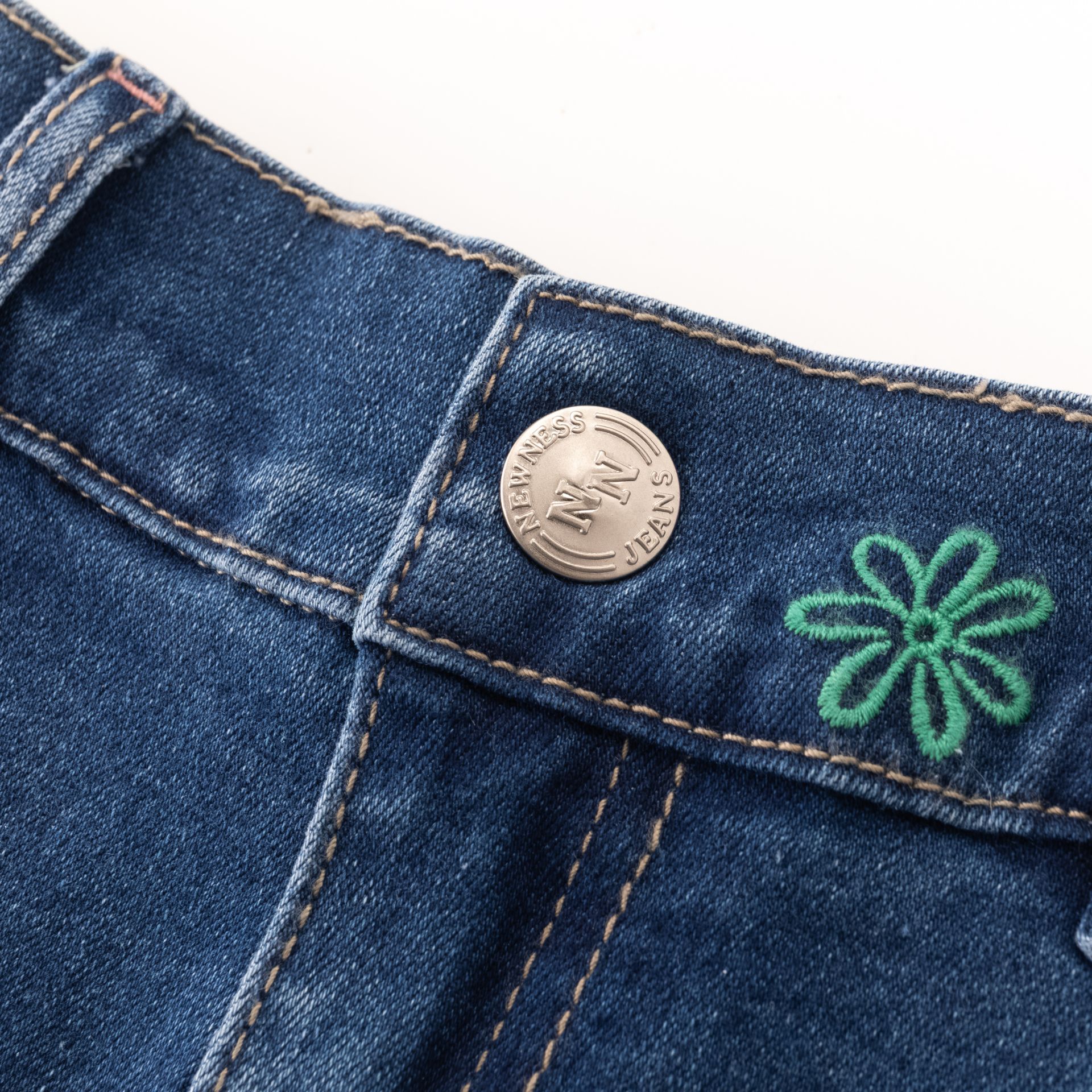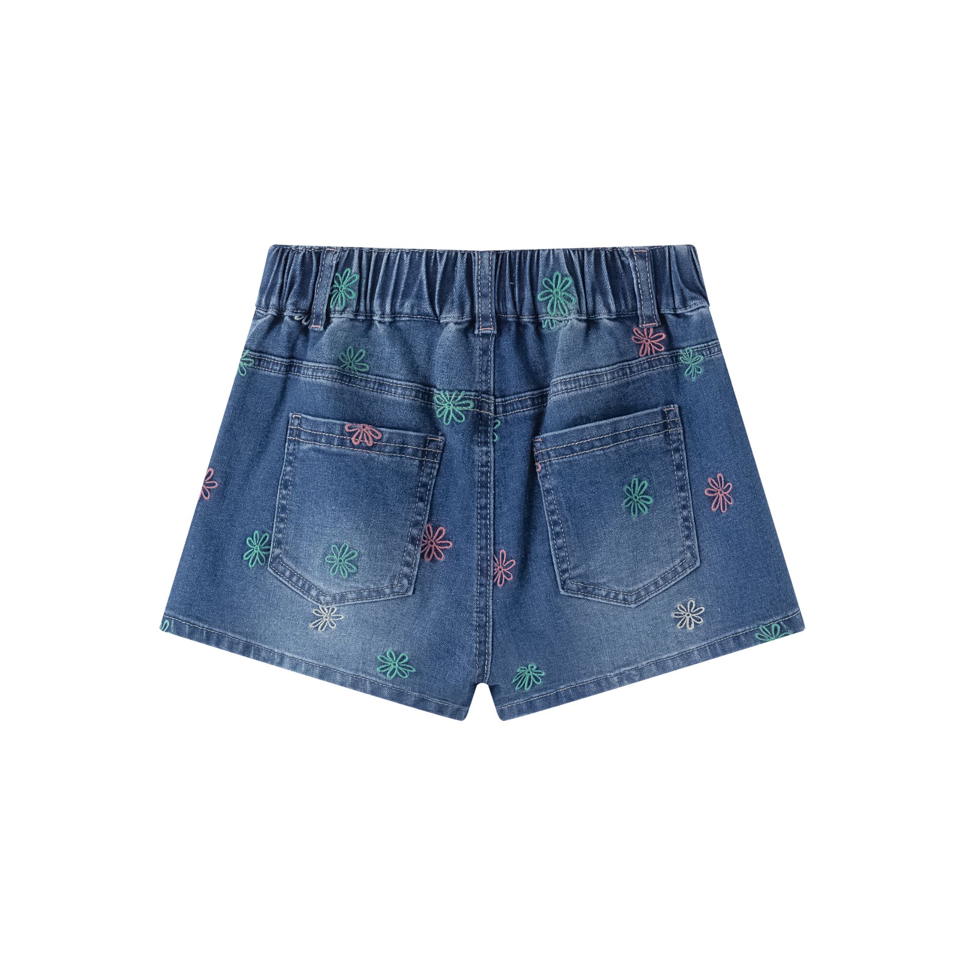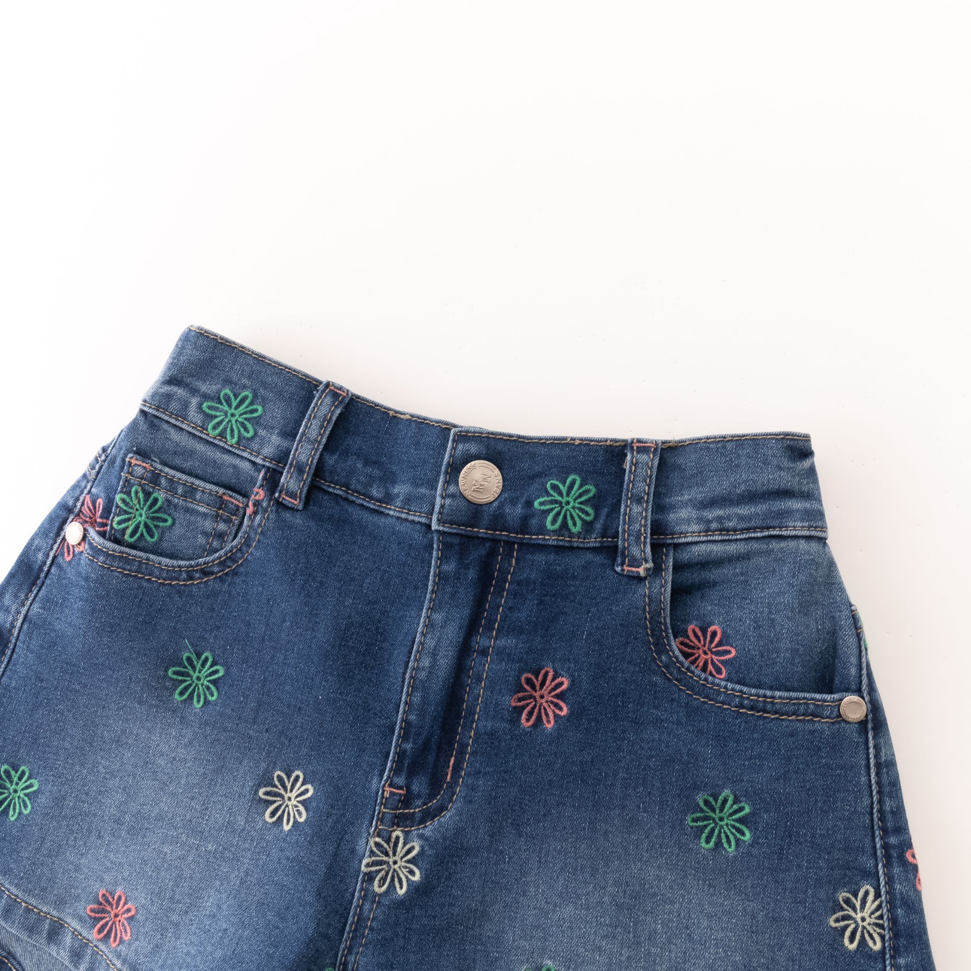 Calções de ganga azul de menina com bordados de flores em várias cores, para dar um toque divertido e diferente ao clássico denim.