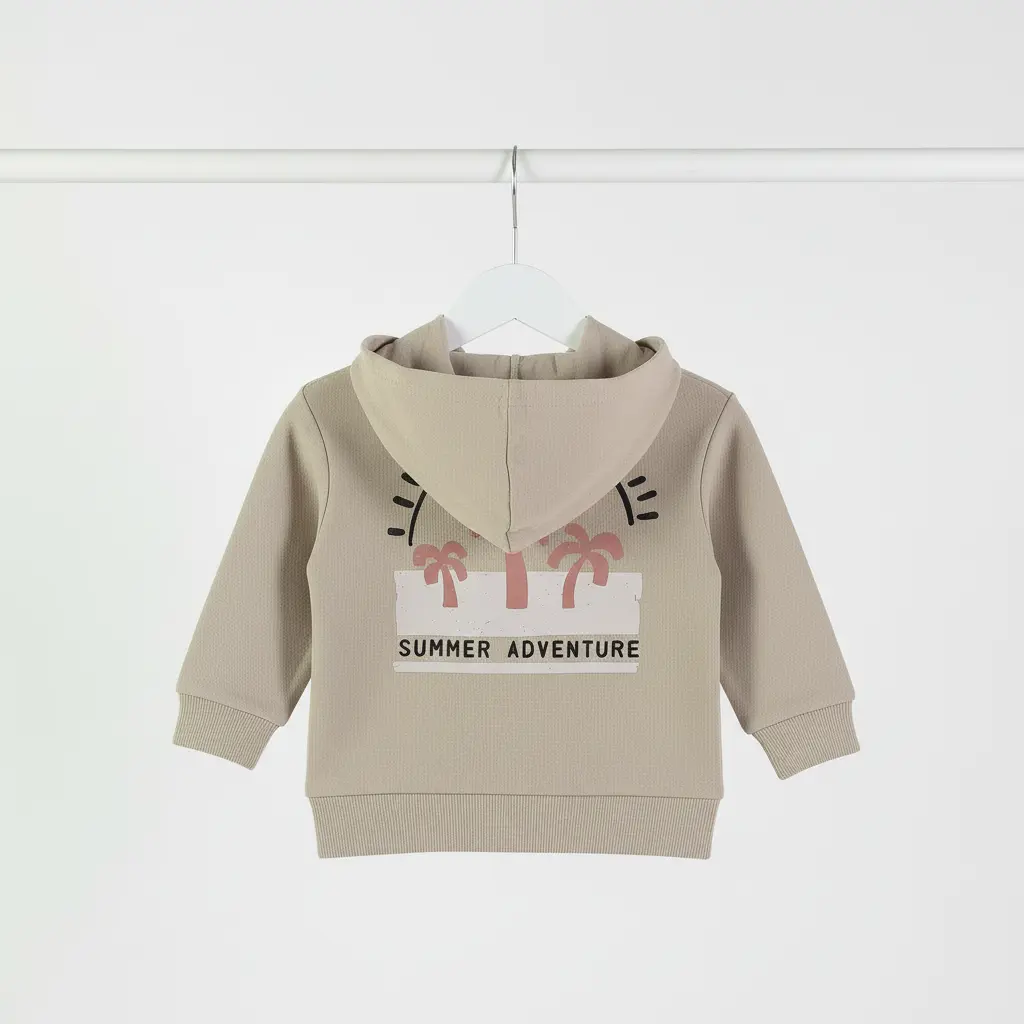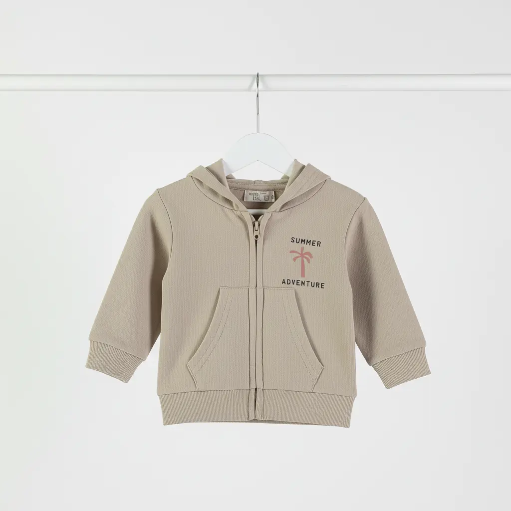 Casaco para bebé em tom bege/areia, com capuz, fecho éclair e bolso canguru. Estampado “Summer Adventure” no peito. Confortável e ideal para meia-estação.