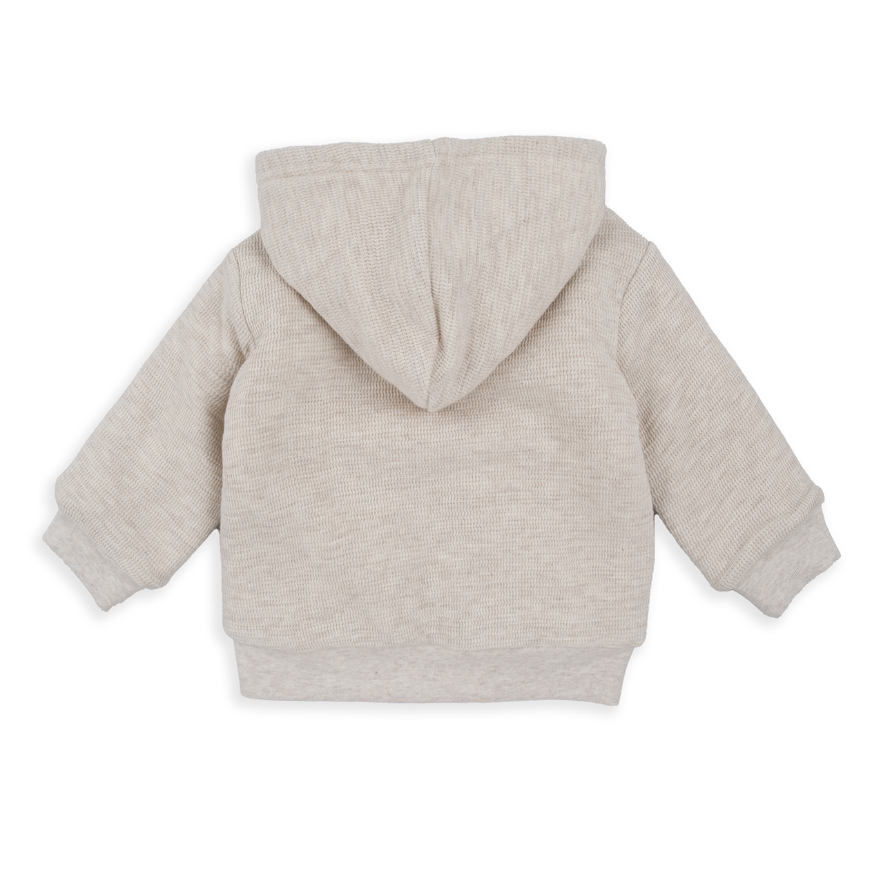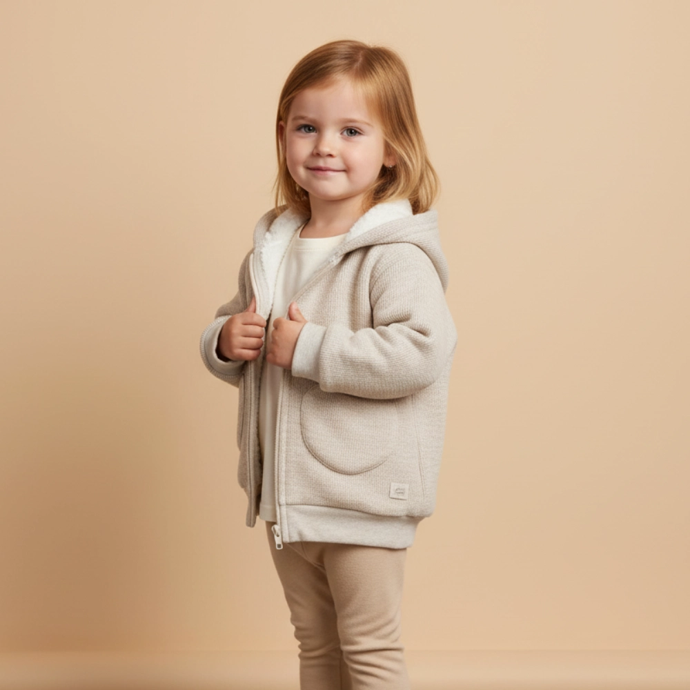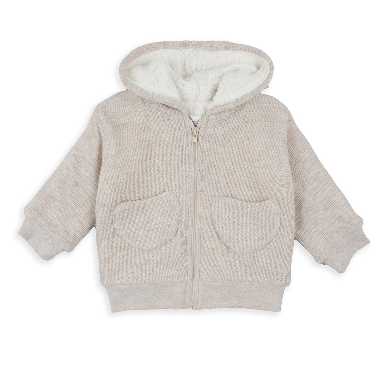 Casaco de menina super quentinho, em malha canelada tom aveia, forrado a sherpa branca por dentro do capuz. Fecha à frente com fecho e tem bolsos aplicados arredondados (efeito coração). Um essencial cosy para os dias frios.