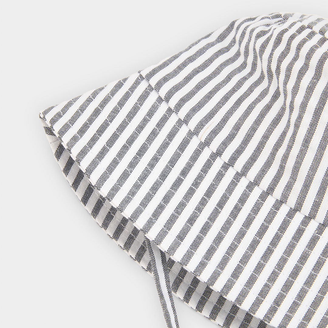 Chapéu tipo bucket às riscas, com atilhos para ficar bem seguro — perfeito para os mais pequenos que não param quietos. Leve, fresquinho e fácil de combinar, é daqueles essenciais para passeios, férias e dias de sol.