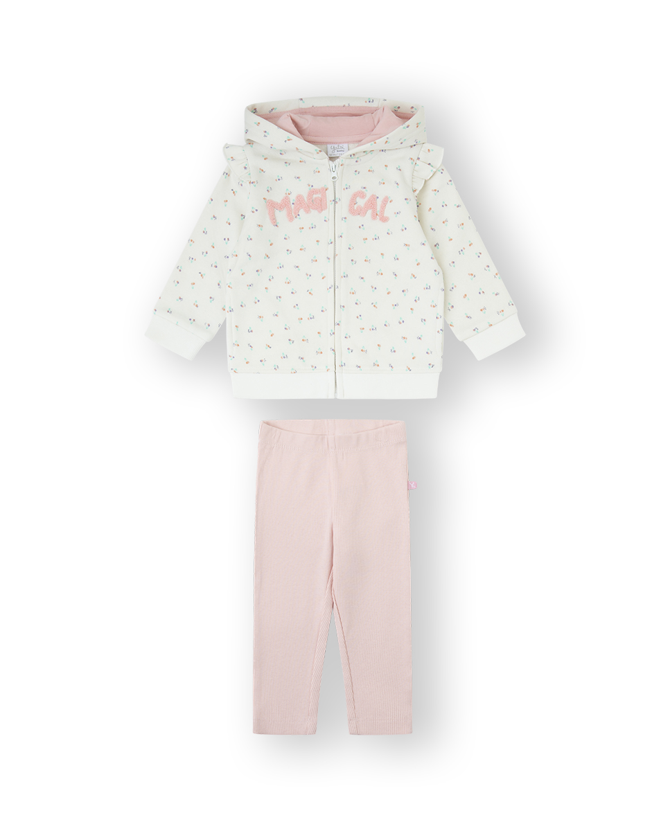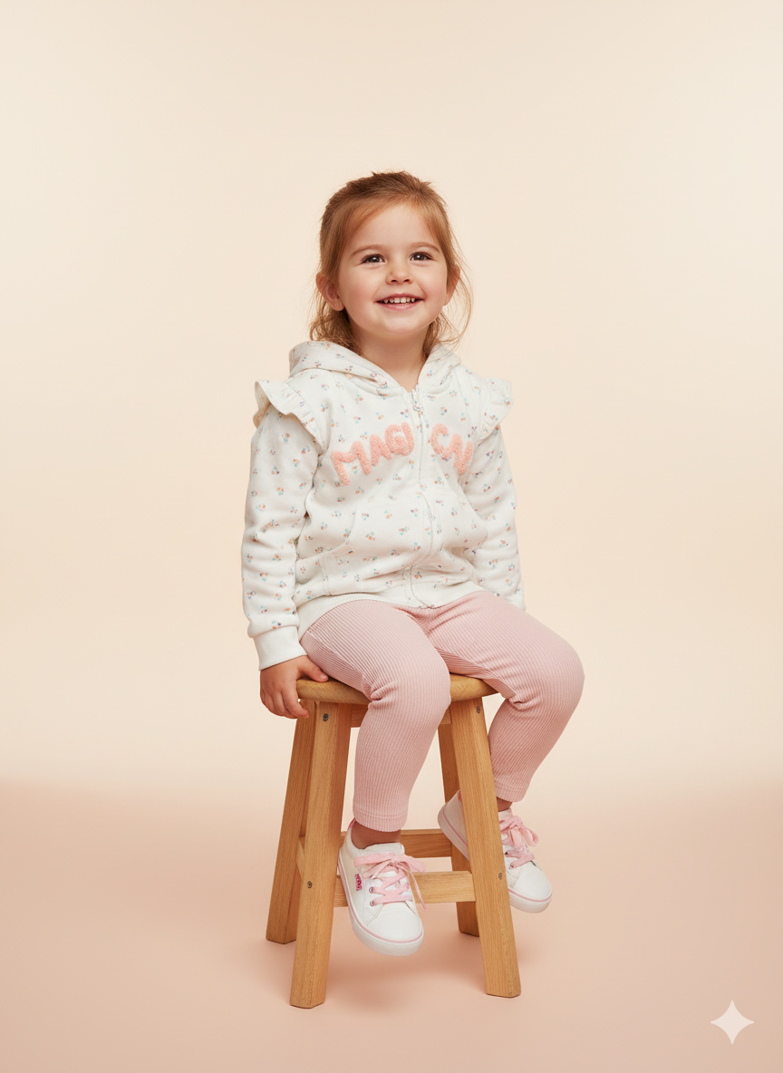 A menina veste uma sweatshirt cremosa com capuz, folhos delicados e estampado floral, com a palavra MAGICAL em relevo macio, combinada com calças caneladas rosa-claro.