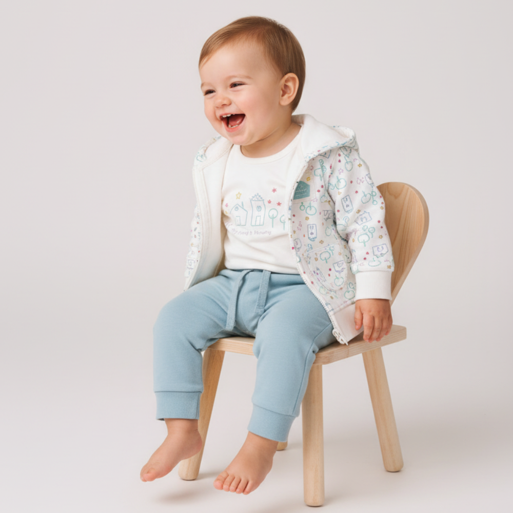 Conjunto 3 peças para bebé: casaco com capuz estampado, t-shirt suave e calças em felpa azul. Confortável e prático, ideal para os dias fresquinhos e muitas brincadeiras