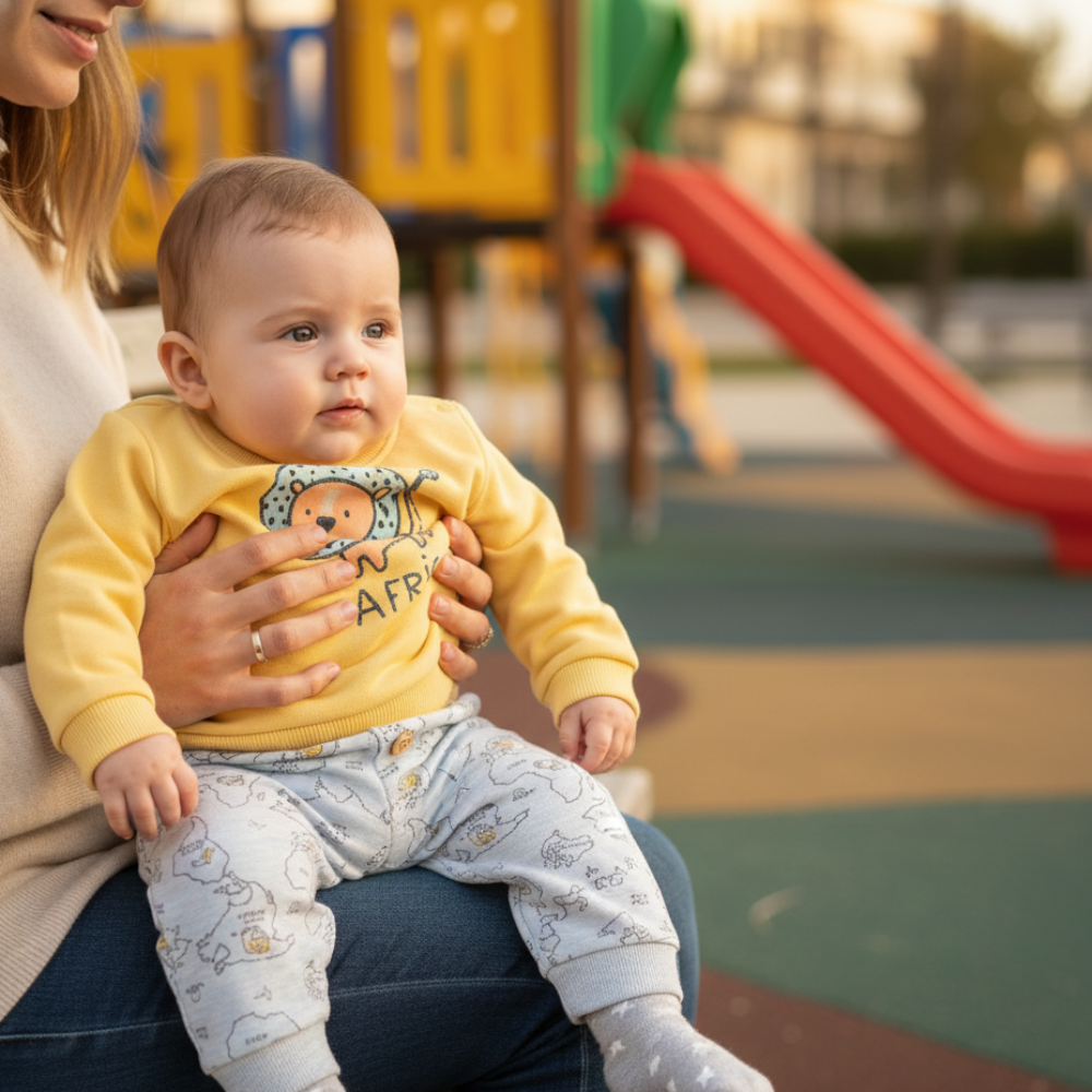 Bebé com roupa amarela e cinza no colo de adulto em parque infantil