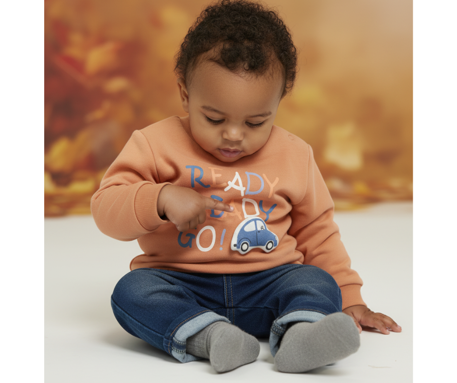 Conjunto cardado, as calças são elásticas e têm pêlo por dentro. A camisola é de algodão muito macio e tem um aplique de um carro em 3D na frente.