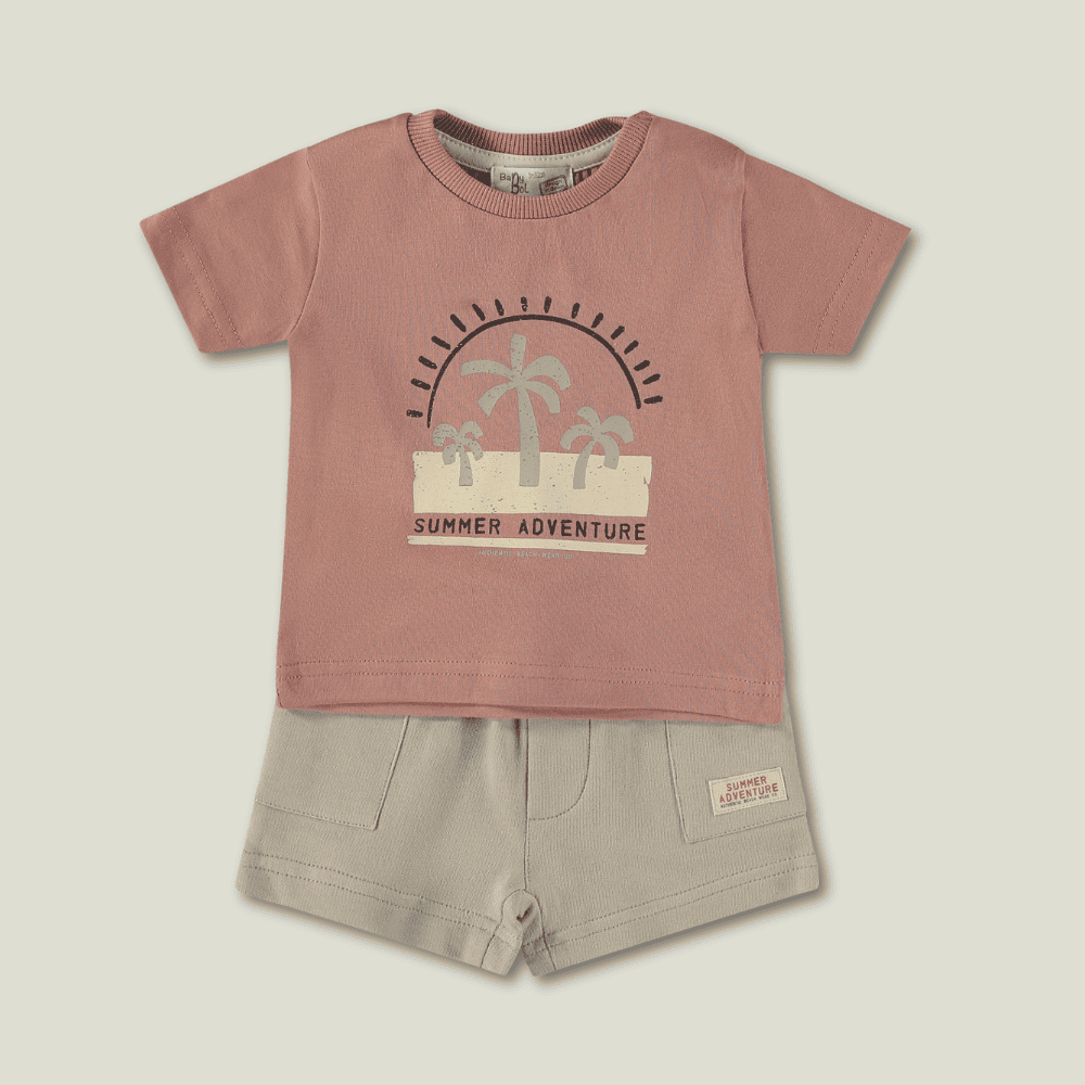 Conjunto para bebé com t-shirt rosa de manga curta com estampado “Summer Adventure” e abertura no ombro, e calções bege com bolsos frontais. Um look confortável e perfeito para o verão.