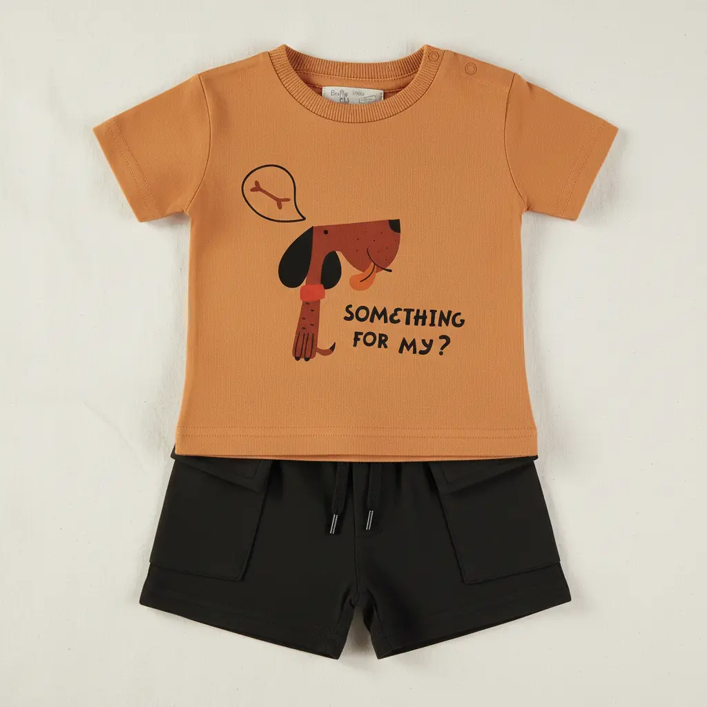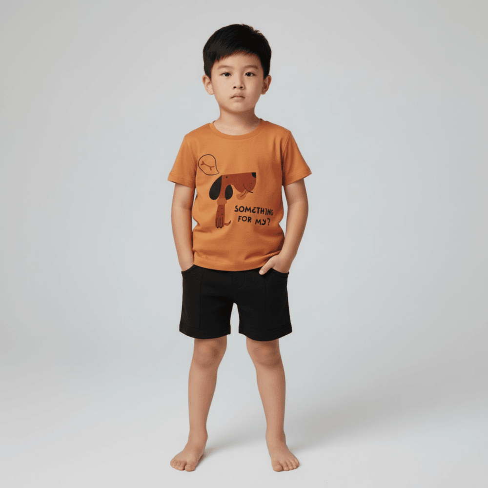 Conjunto com t-shirt laranja de manga curta com estampado de cão e frase “Something for my?”, com abertura no ombro, e calções pretos com bolsos. Confortável e perfeito para o dia a dia no verão.
