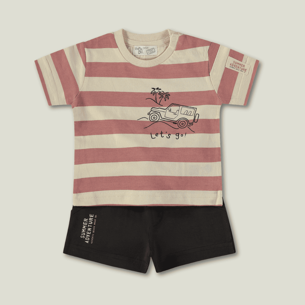 Conjunto com t-shirt de manga curta às riscas em rosa e creme, com estampado de jipe e mensagem “Let’s go!”, com abertura no ombro, e calções pretos a condizer. Confortável e perfeito para o verão.