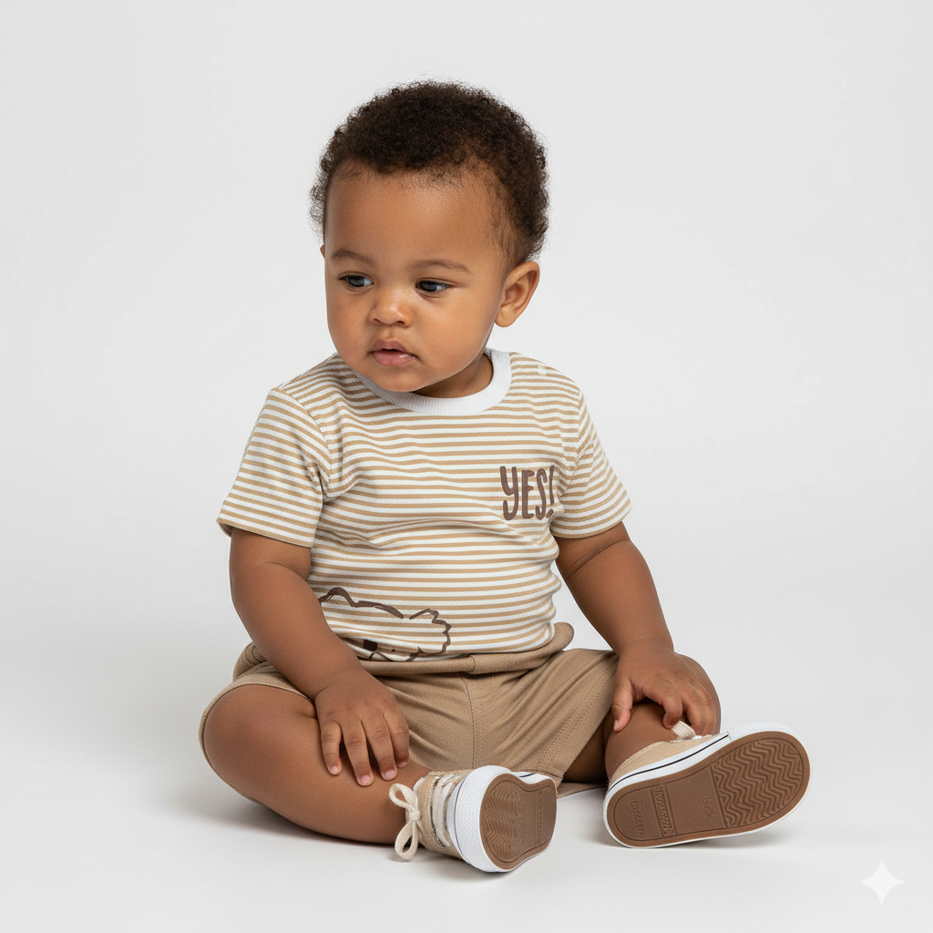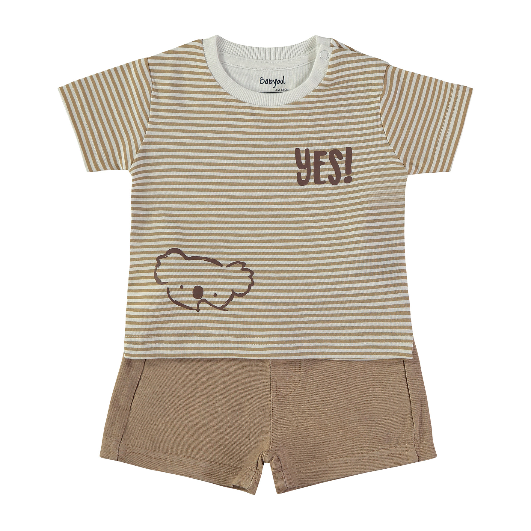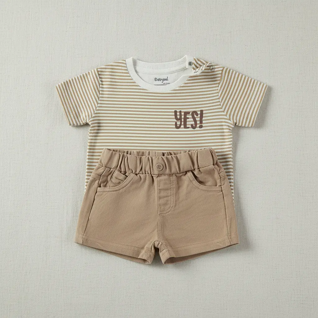 Conjunto para bebé com t-shirt de manga curta às riscas em tons areia e branco, com detalhe “YES!” e botões no ombro, e calções bege com cintura elástica e bolsos. Confortável e prático para o verão.