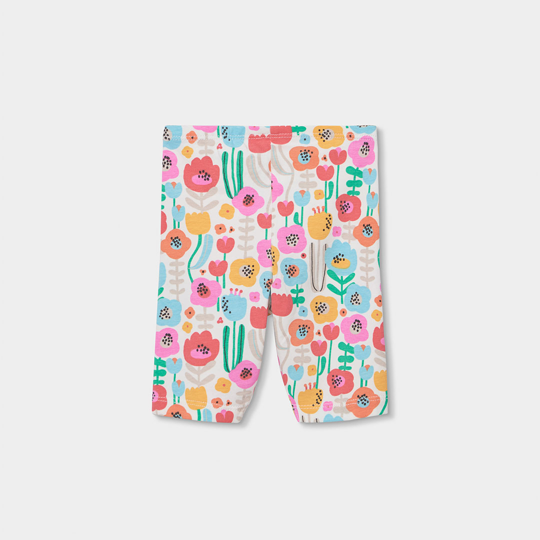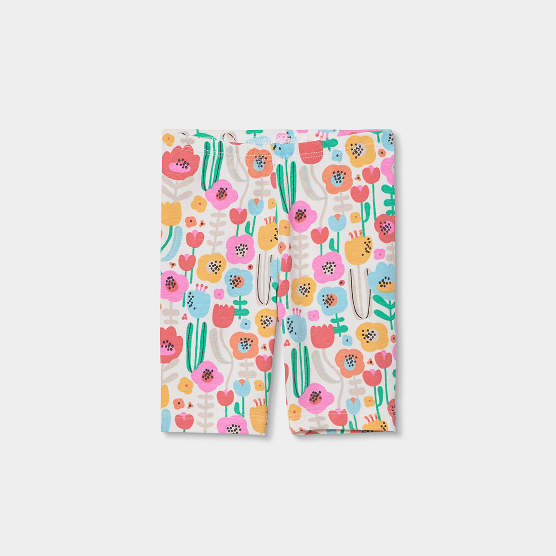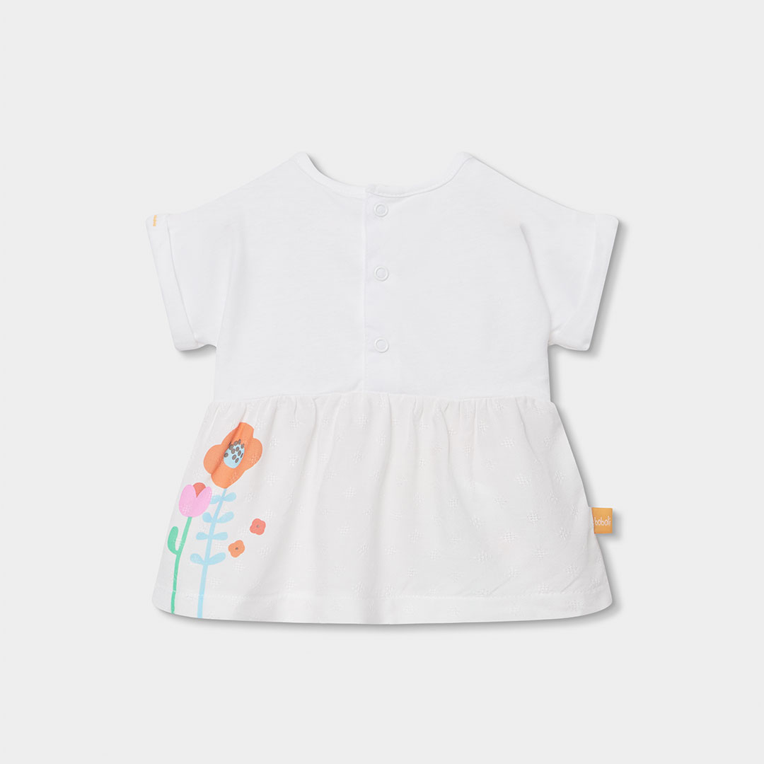 Conjunto para bebé menina com túnica branca de manga curta e saia com franzido, detalhe floral e aplicação em relevo, combinado com leggings/calças justas com estampado floral multicolor. Confortável e perfeito para a primavera/verão.