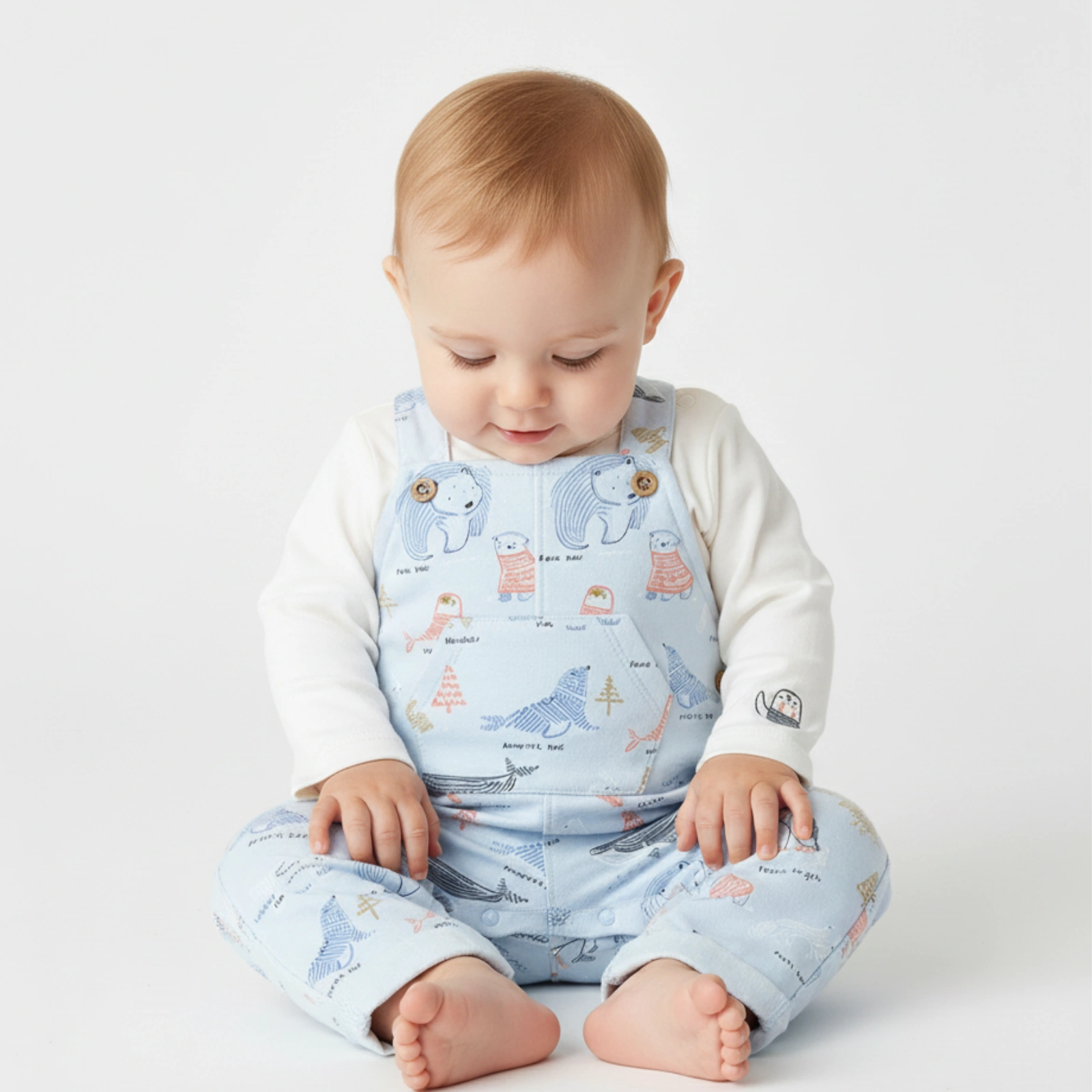 Conjunto 2 peças super confortável para o dia-a-dia: macacão azul claro com estampado de animaizinhos e botões decorativos nos suspensórios, e camisola branca de manga comprida para usar por baixo. Ideal para a creche e para passear — fofinho, prático e cheio de charme.