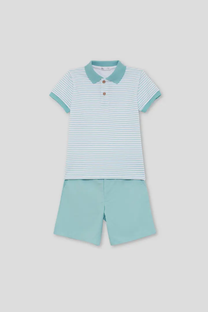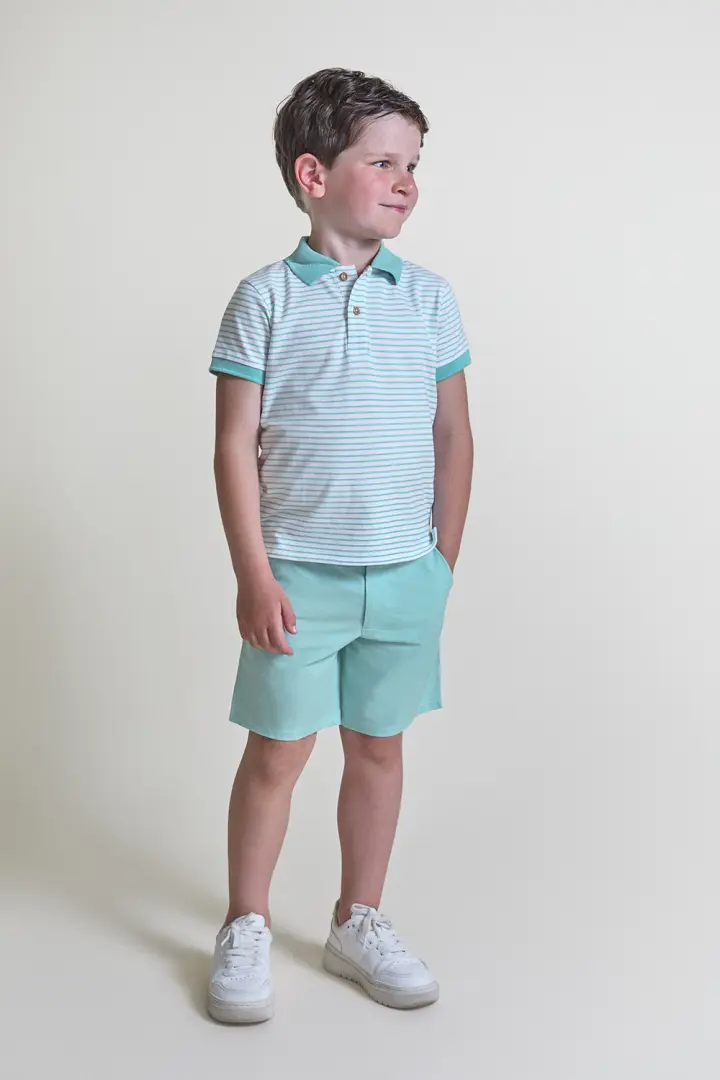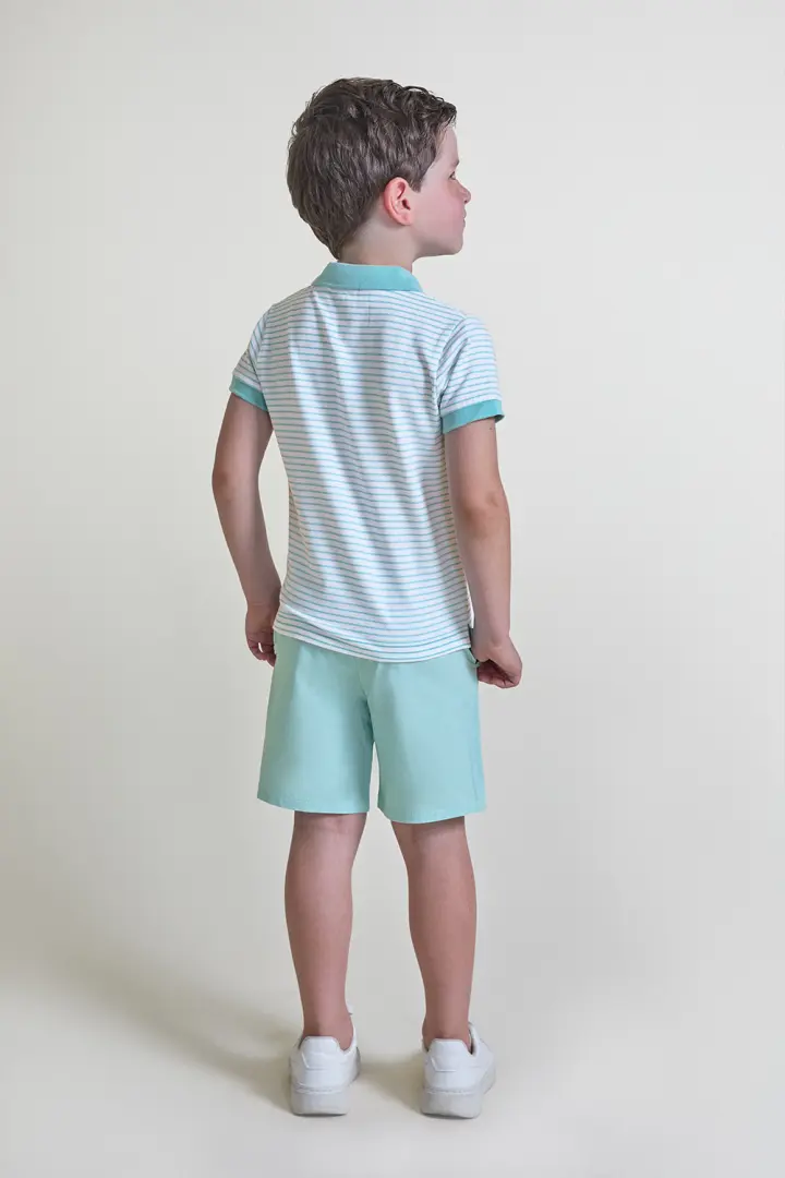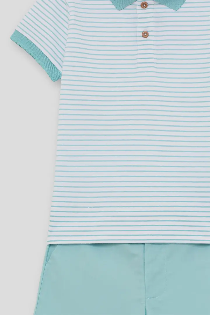 Polo de manga curta em branco com finas riscas turquesa, detalhe de gola e punhos em contraste liso e fecho de botões à frente. Calções em turquesa com cintura elástica para um ajuste confortável. Confecionado em tecido fresco e leve, ideal para os dias de verão.