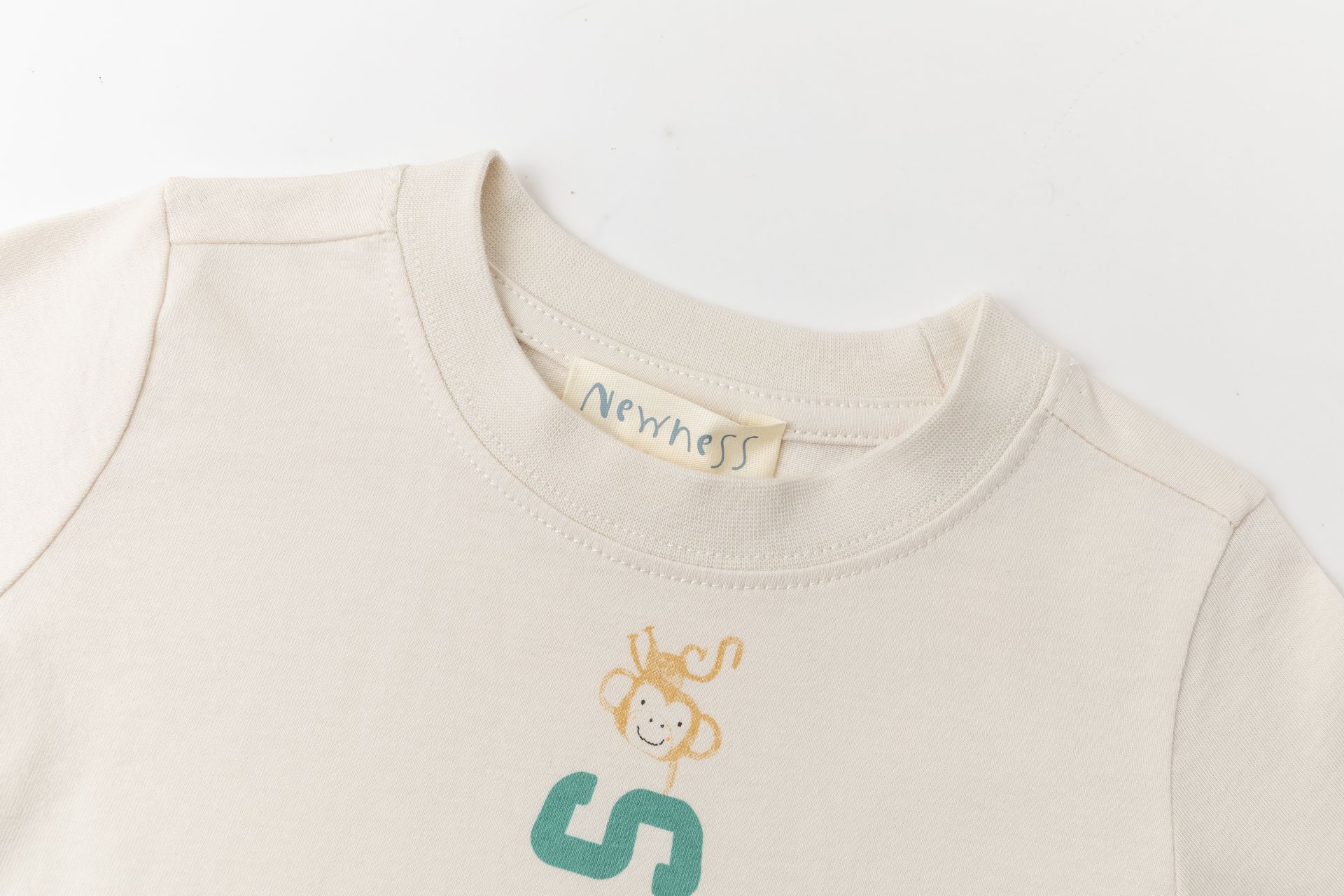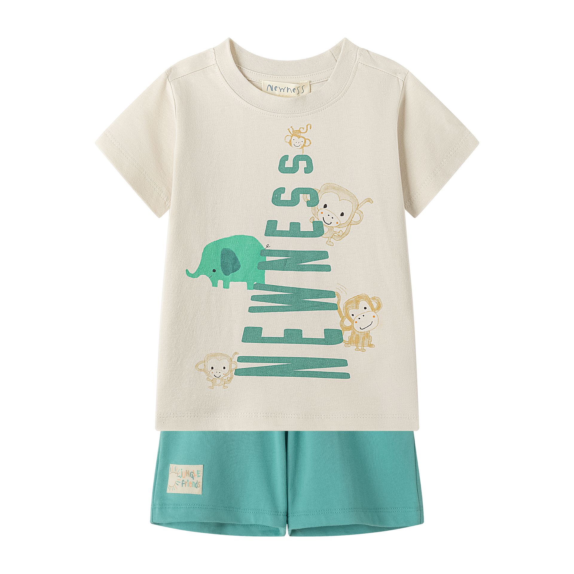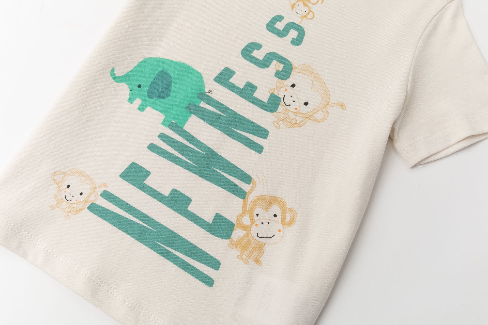 Conjunto prático e giro para os dias quentes: t-shirt em tom bege claro com estampado grande “Newness” e ilustrações de animais (macacos e elefante), combinado com calções verdes que dão um contraste alegre.