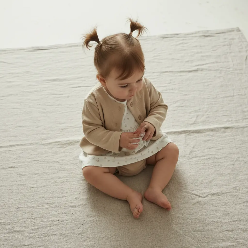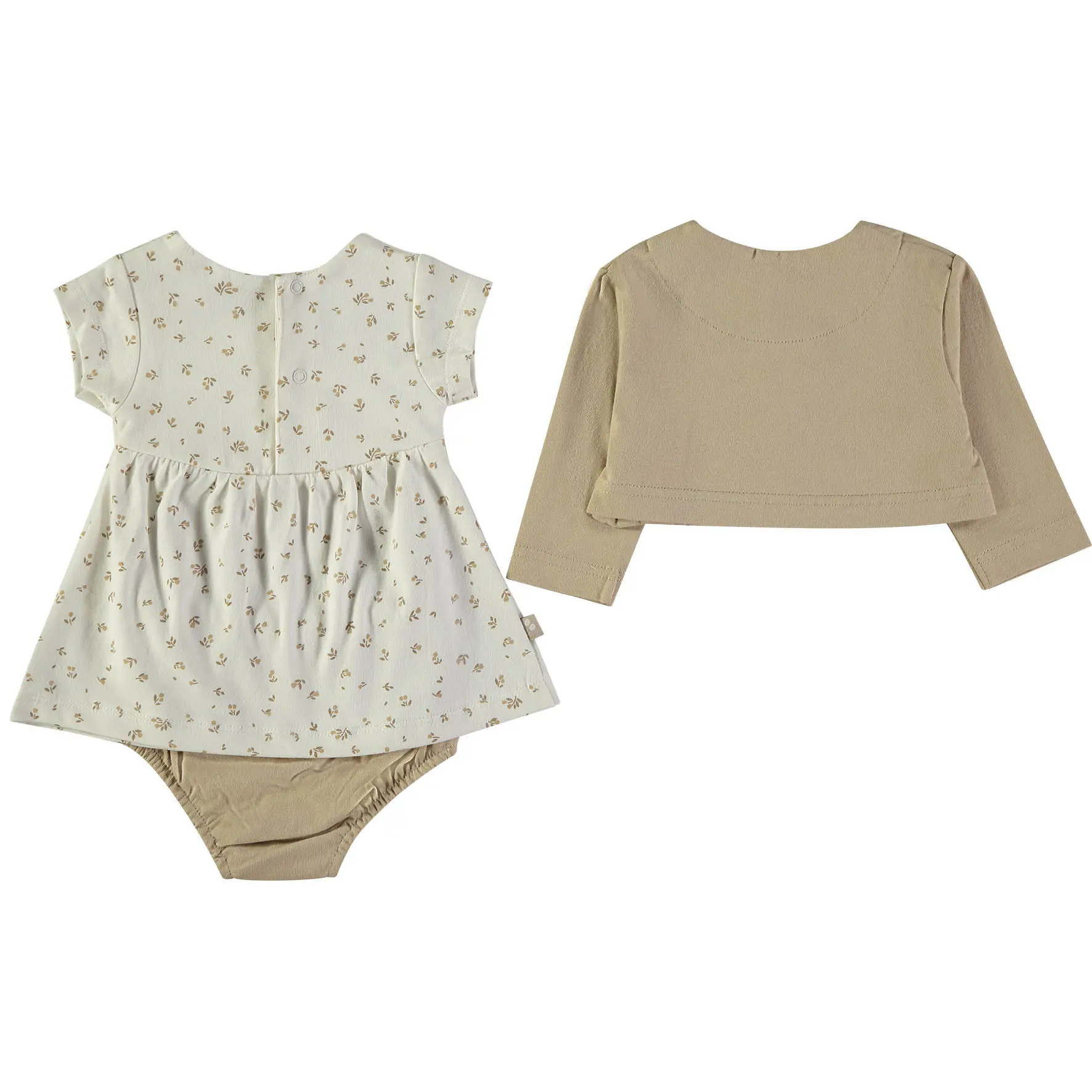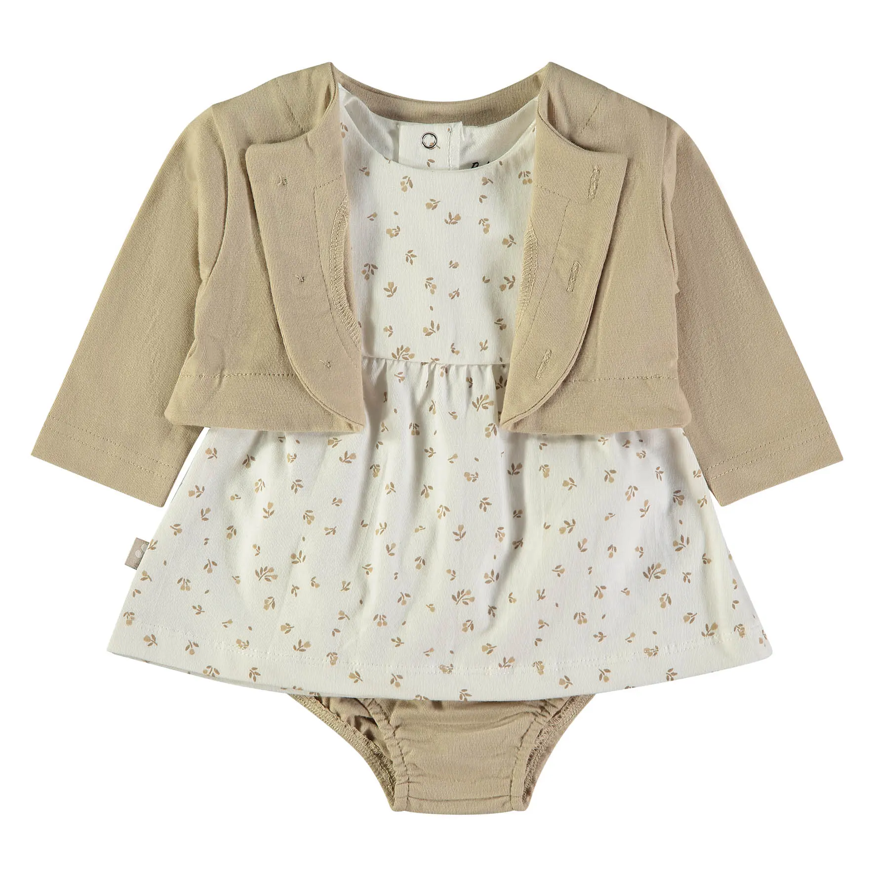 Conjunto de bebé em tons neutros, com vestido/túnica em cru com estampado delicado de folhinhas bege e casaco estilo bolero em areia. Inclui tapa-fraldas a condizer. Ideal para um look confortável e arranjadinho.