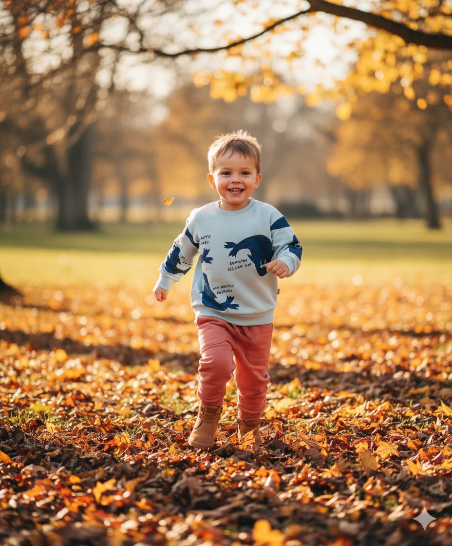 Camisola azul clara com gráficos azuis e calças cor de rosa em criança a correr no parque no outono