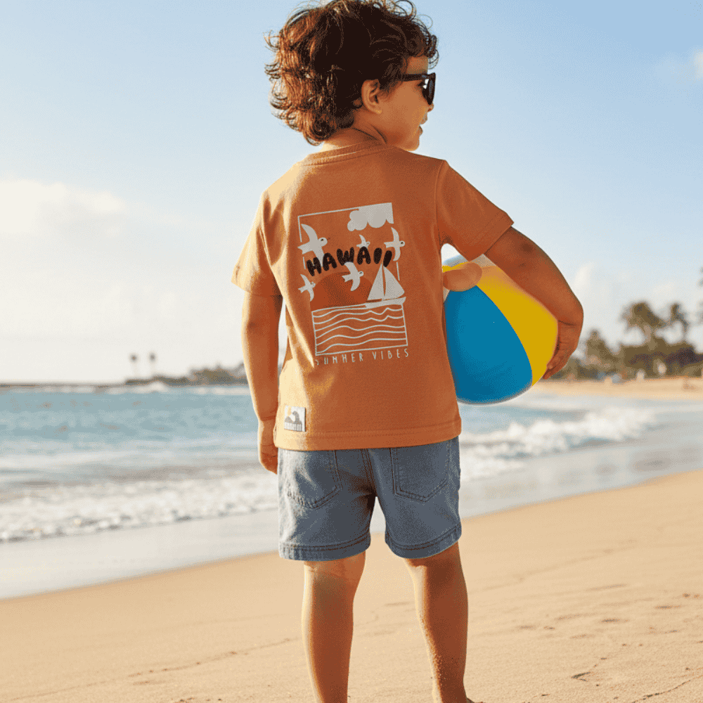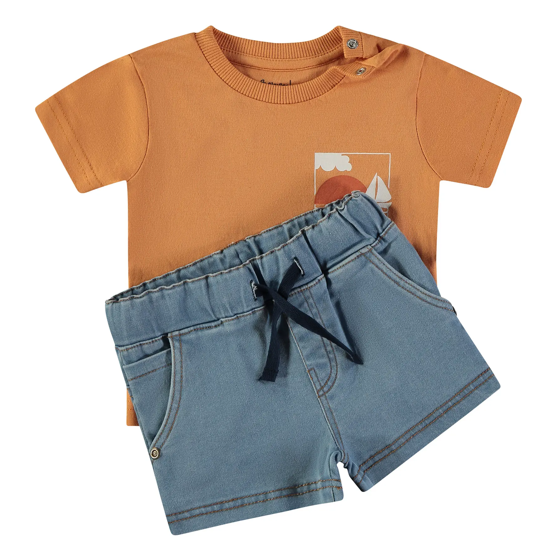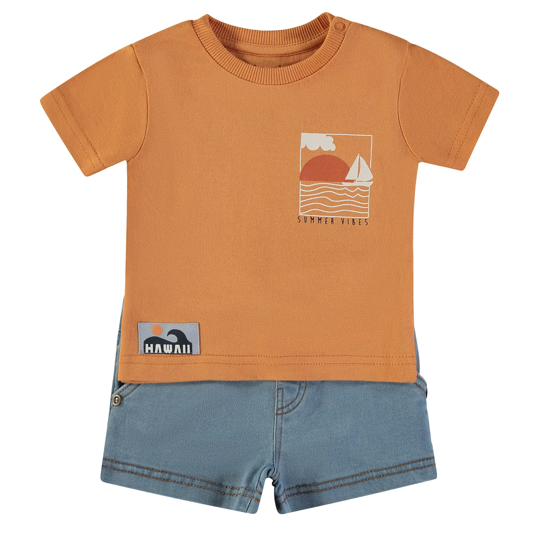 Conjunto de criança com t-shirt laranja de manga curta e estampado discreto na frente e um maior nas costas, e calções azuis com cintura elástica e cordão ajustável. Ideal para dias quentes.