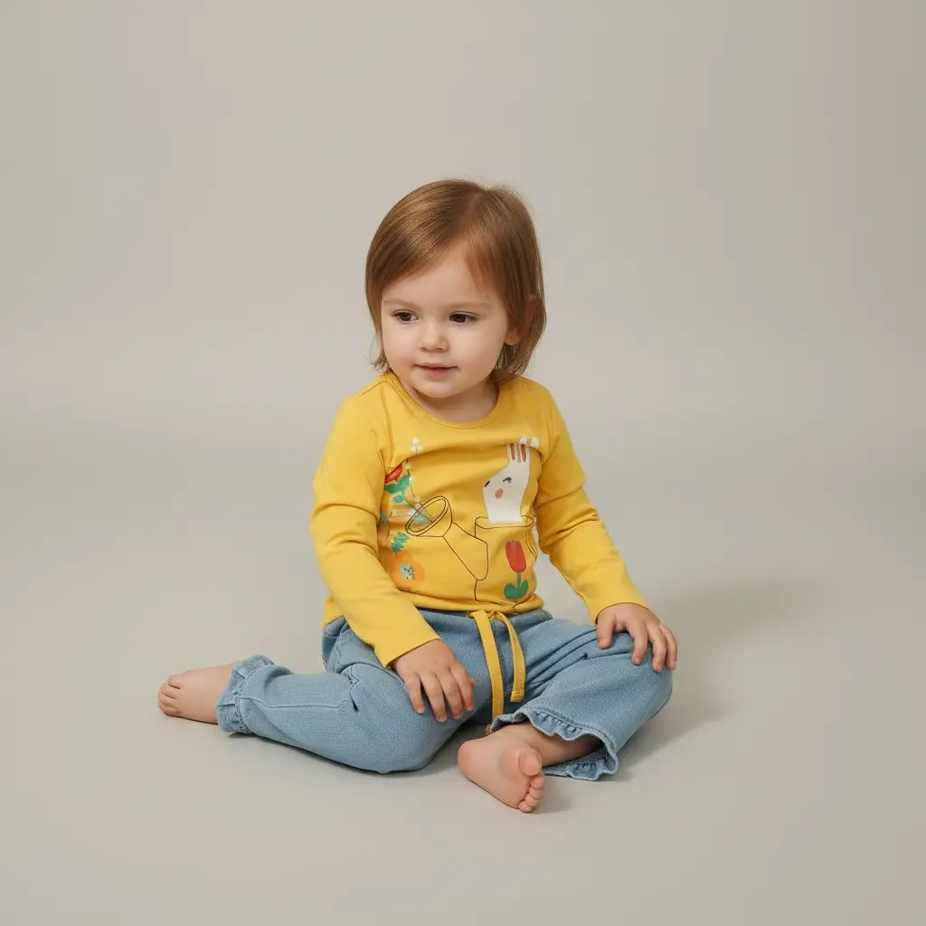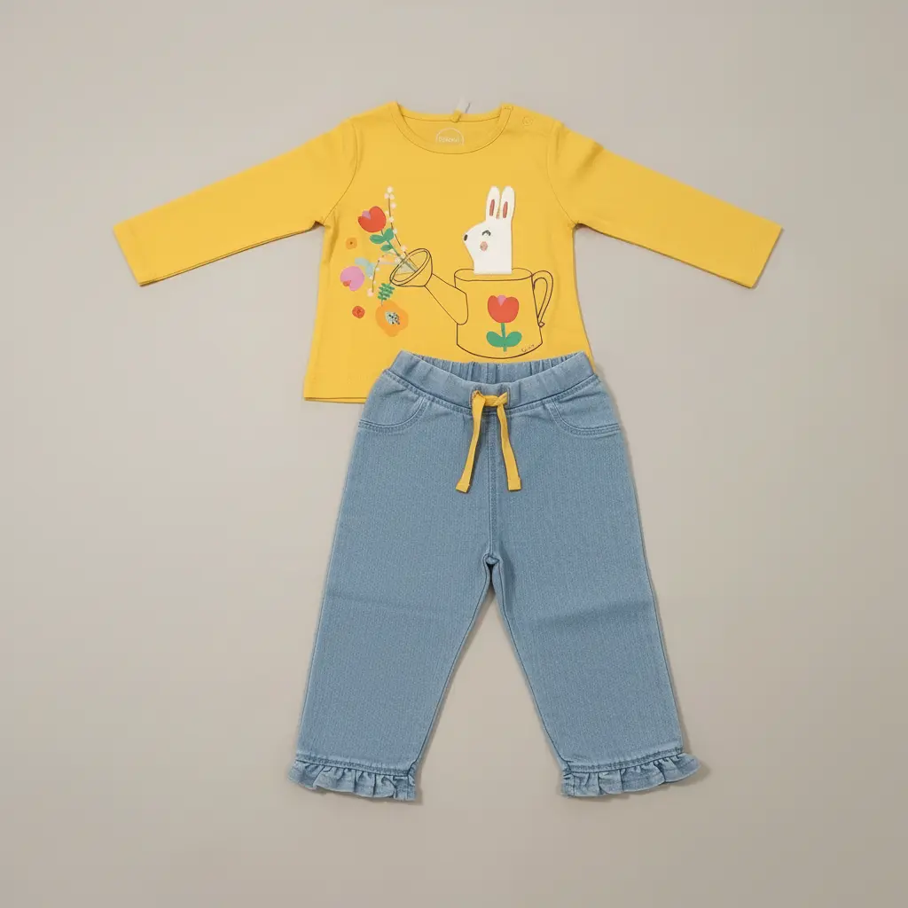 Um conjunto cheio de cor e conforto para os dias de meia-estação. A camisola amarela de manga comprida tem um print adorável de coelhinho num regador com flores, e combina na perfeição com as calças azul claro efeito ganga, com cintura elástica, cordão decorativo e folho na bainha para um toque ainda mais fofo.