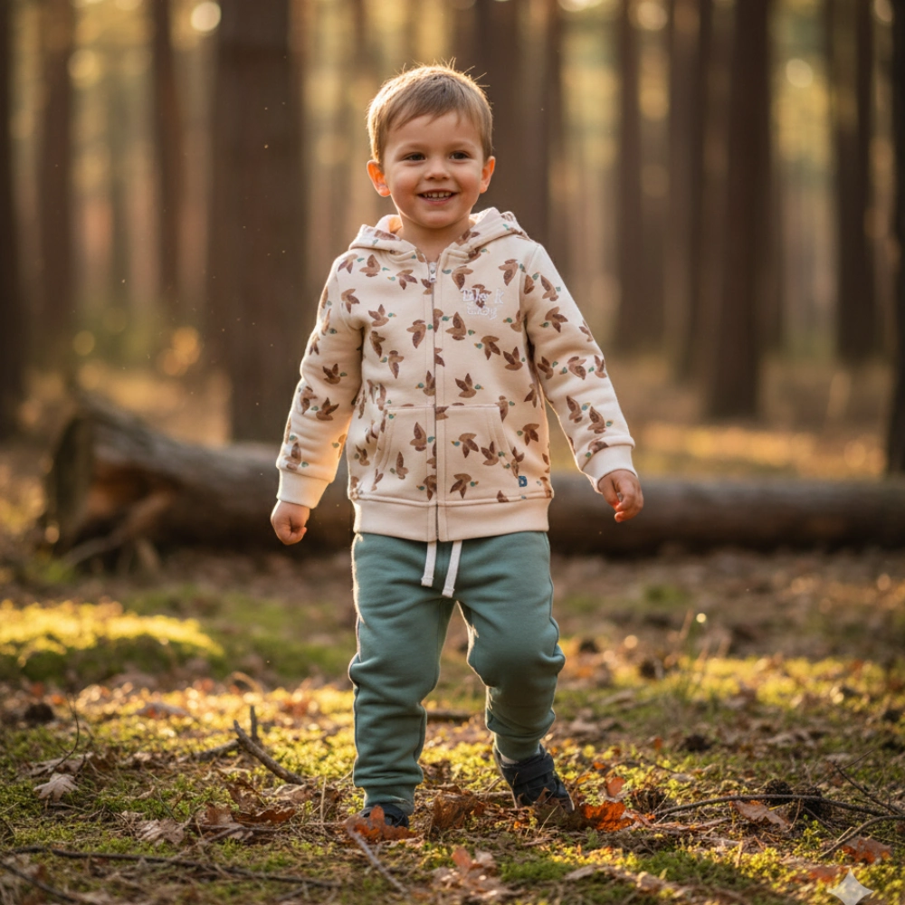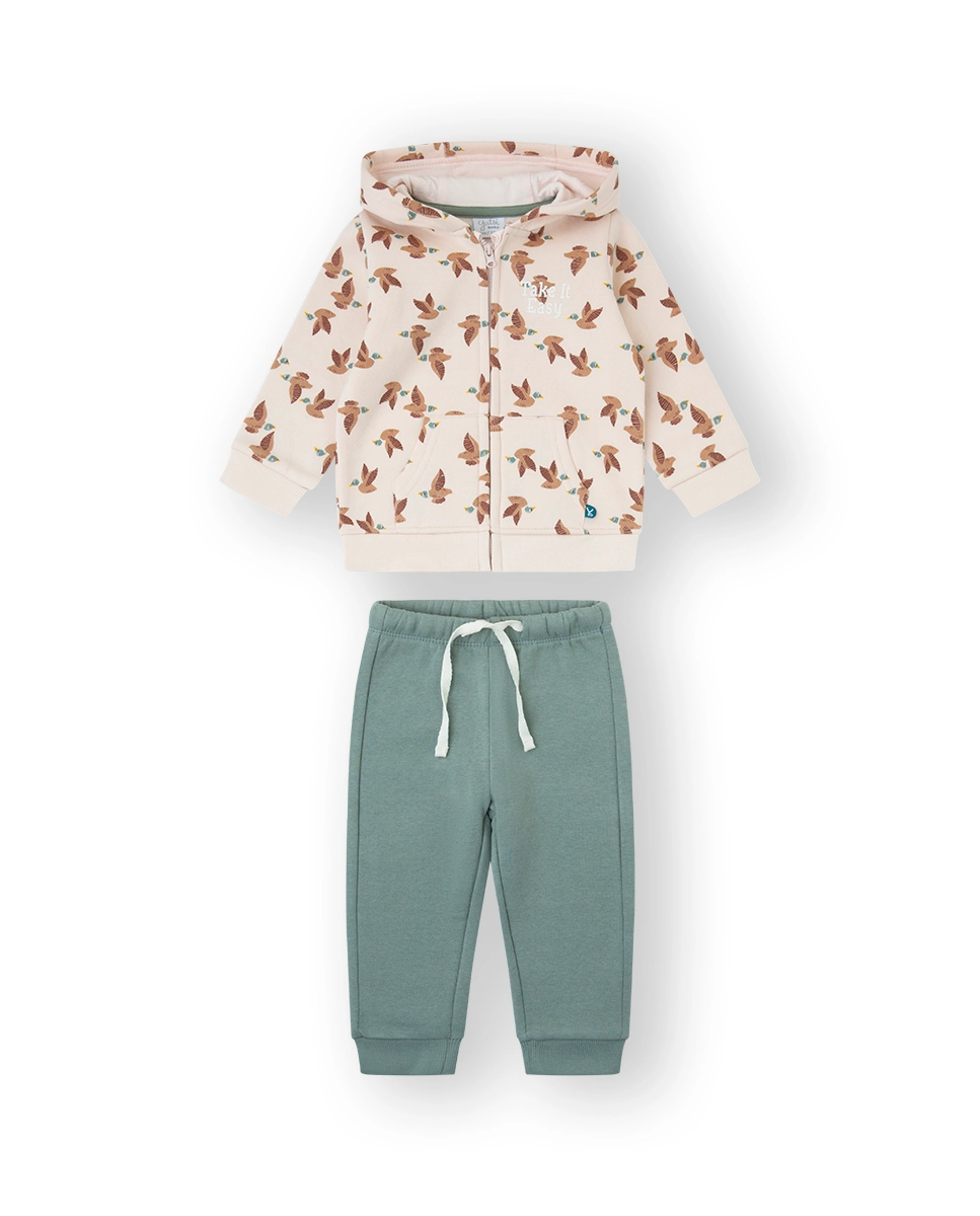 Inclui casaco cardado com capuz e fecho em tom creme com estampado de pássaros e bolso canguru, e calças de felpa, cardadas, em verde-sálvia com cintura elástica e cordão ajustável. O corte é prático e descontraído, pensado para liberdade de movimentos e muito conforto.