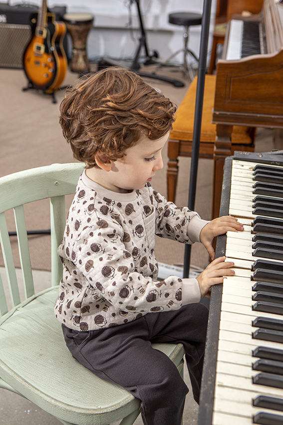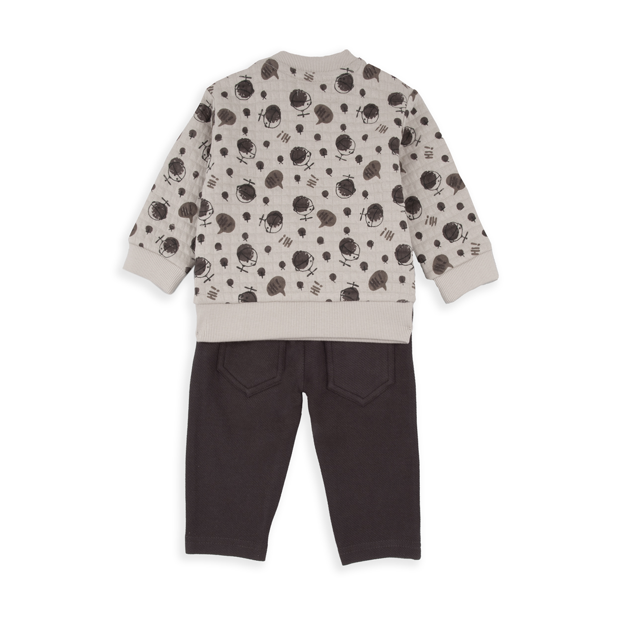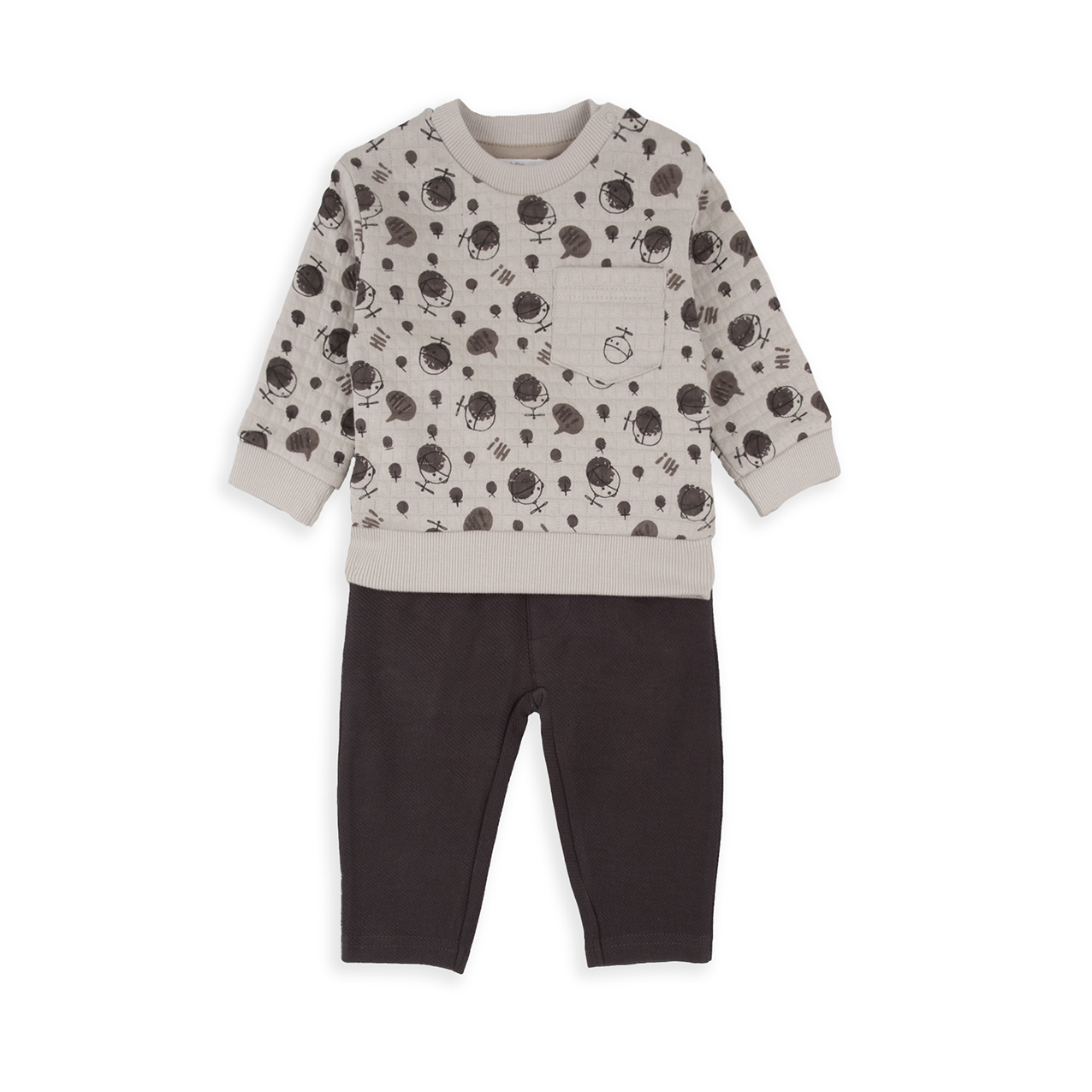 Conjunto prático e confortável para o dia-a-dia: sweat em tom cru com estampado divertido e bolso no peito, e calças escuras macias com cintura elástica. Um essencial fácil de vestir para brincar com estilo.