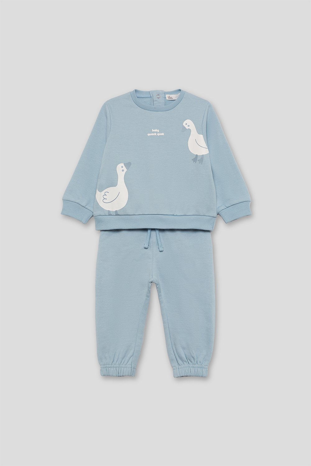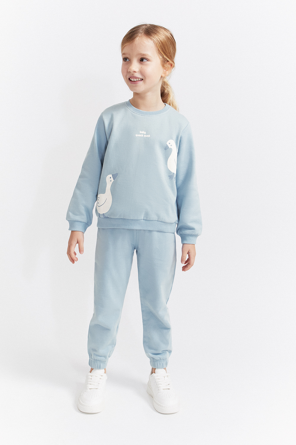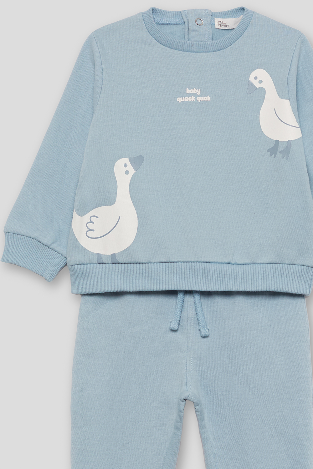 A sweatshirt de manga comprida apresenta um design divertido com patinhos estampados na frente e o texto “baby queek queek” ao centro do peito. Gola redonda e acabamentos canelados nos punhos e na bainha garantem um ajuste confortável.