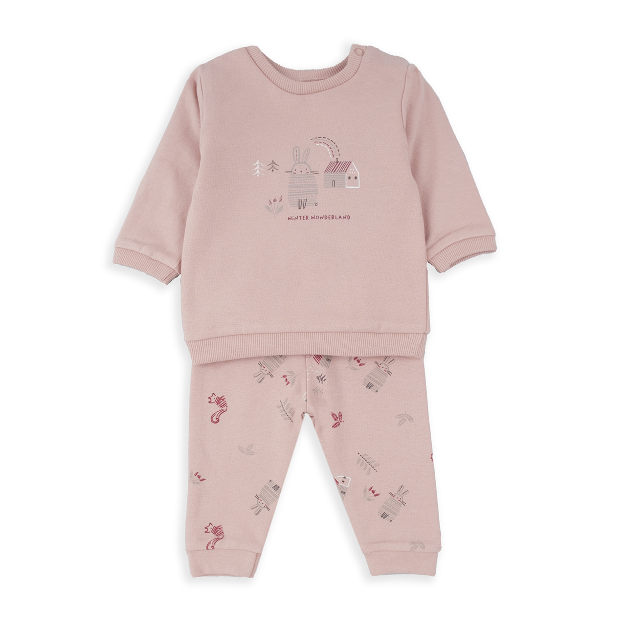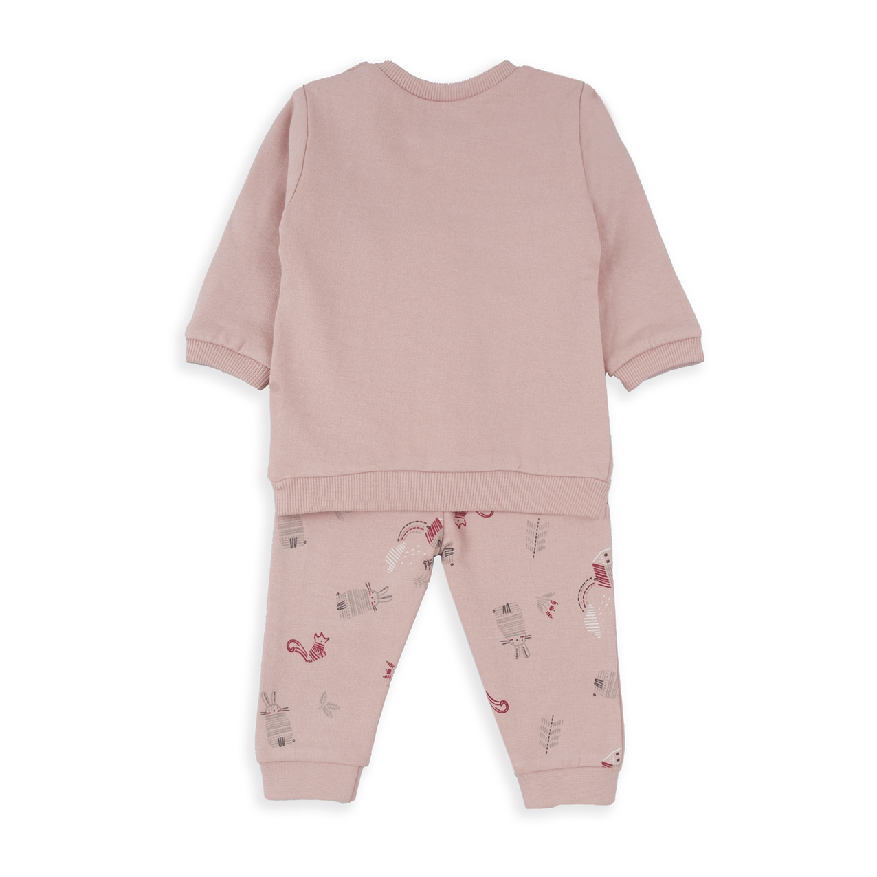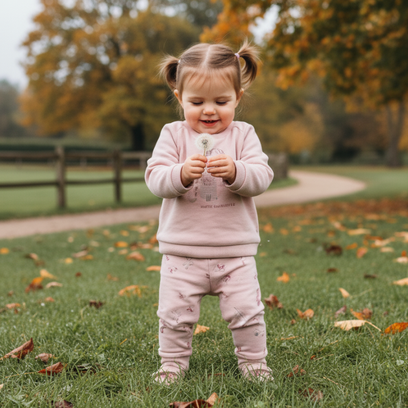As calças a combinar, também em rosa suave, têm um padrão delicado e ajuste confortável, permitindo à criança correr, brincar e saltar à vontade. O conjunto é ideal para dias frescos, passeios ao ar livre e momentos de brincadeira no parque.