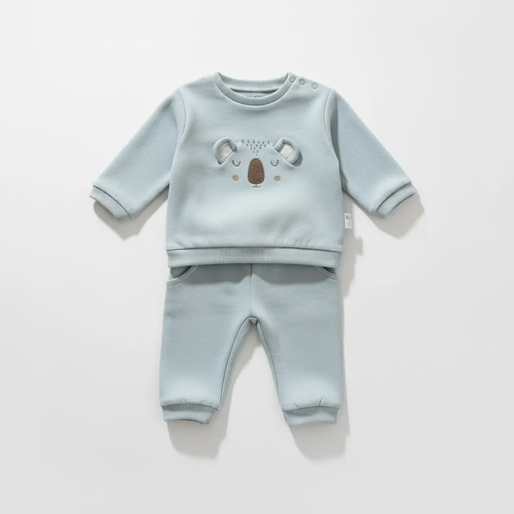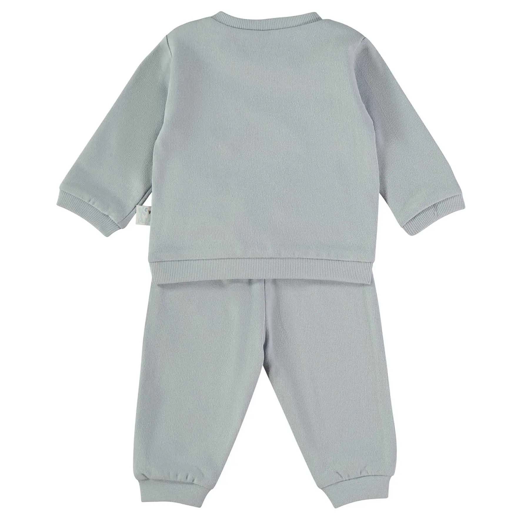 Fato de treino de bebé em azul claro, composto por camisola e calças a condizer, com detalhe de carinha de ursinho à frente. Confortável e prático para o dia a dia.