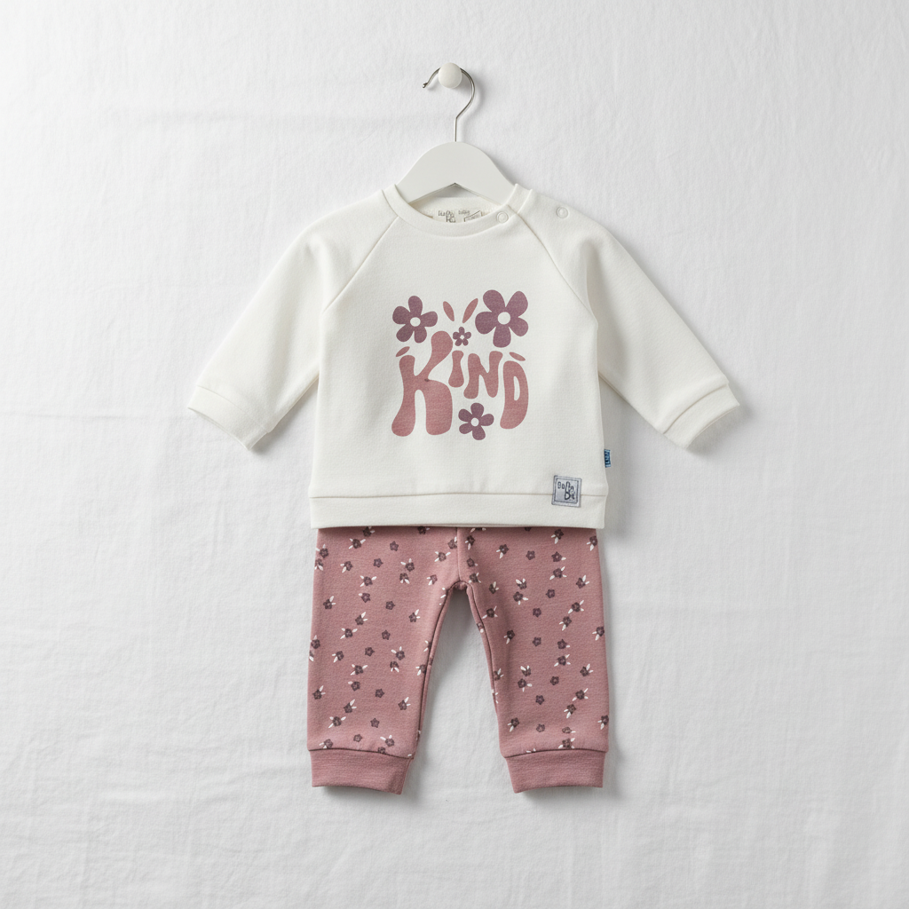 Fato de treino cardado de duas peças, super macio e quentinho por dentro — perfeito para os dias mais frescos. Sweatshirt branca com estampado “KIND” e flores em tons de malva, combinada com calças em rosa velho com padrão floral e cintura elástica para maior conforto. Ideal para o dia a dia, com liberdade de movimentos.