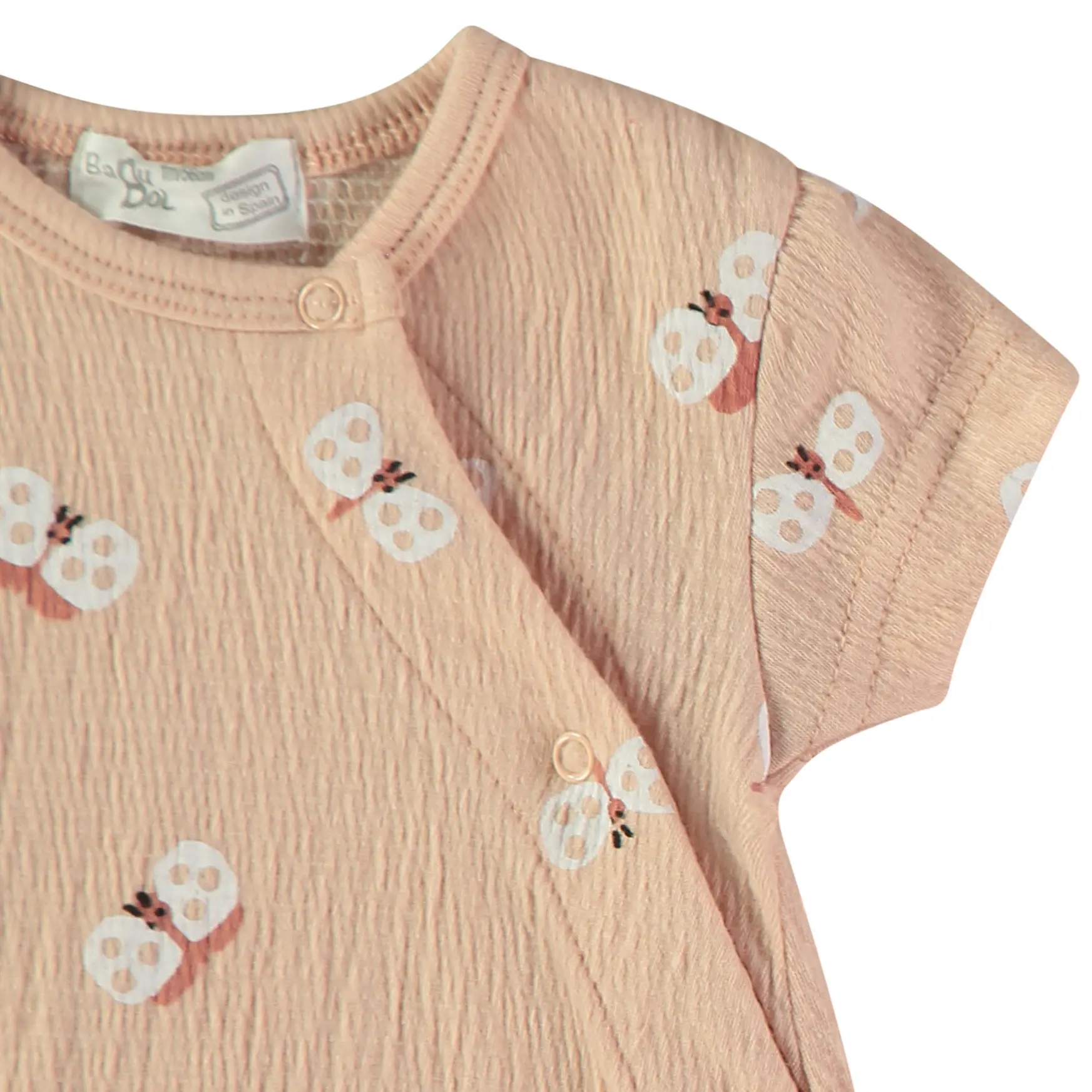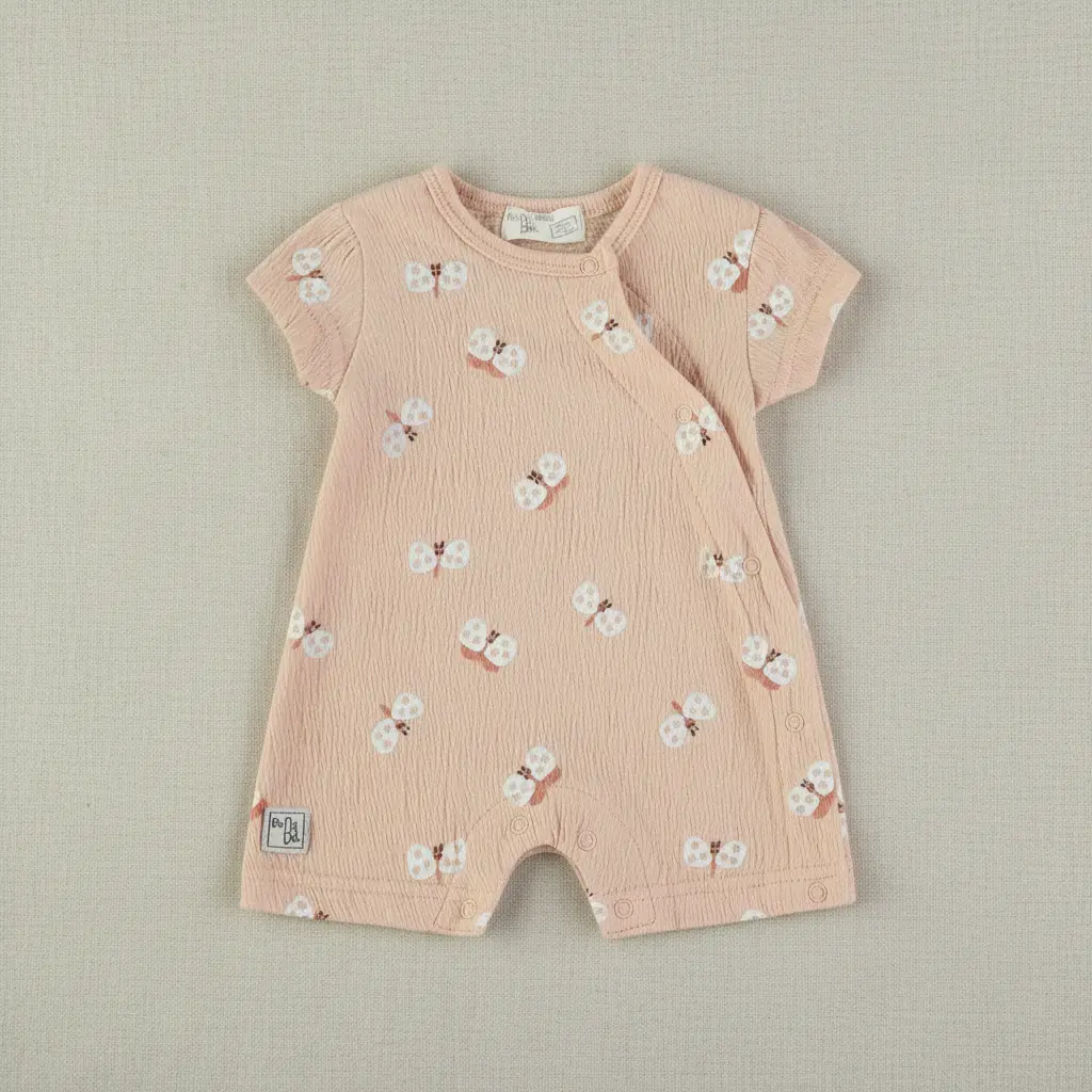 Fofo curto em tom pêssego com estampado de borboletas e textura suave. Abertura cruzada lateral e na entreperna com botões de pressão para vestir e mudar a fralda com facilidade.