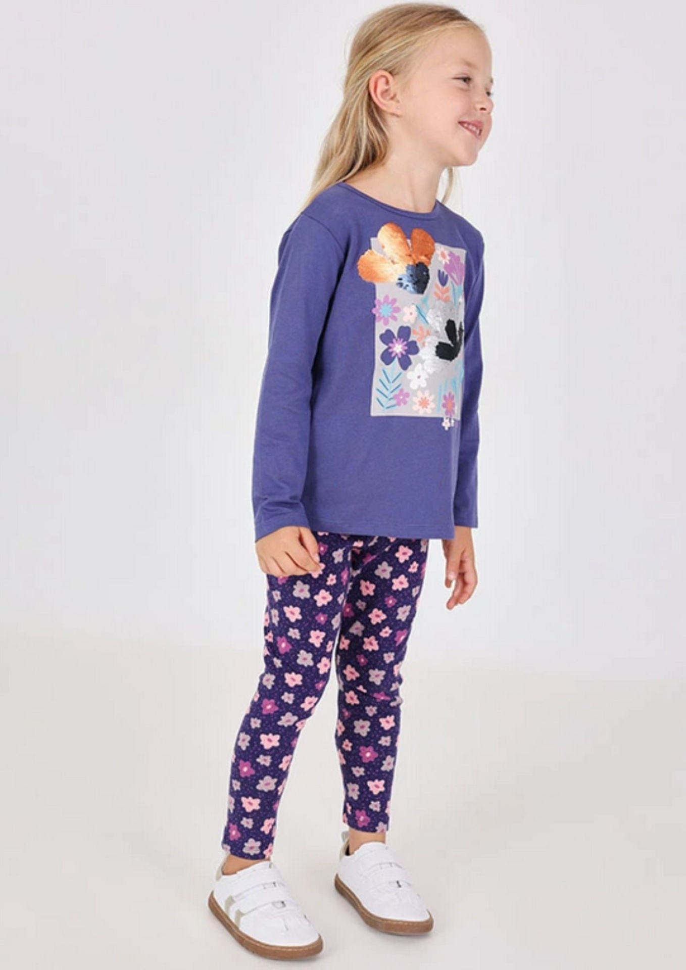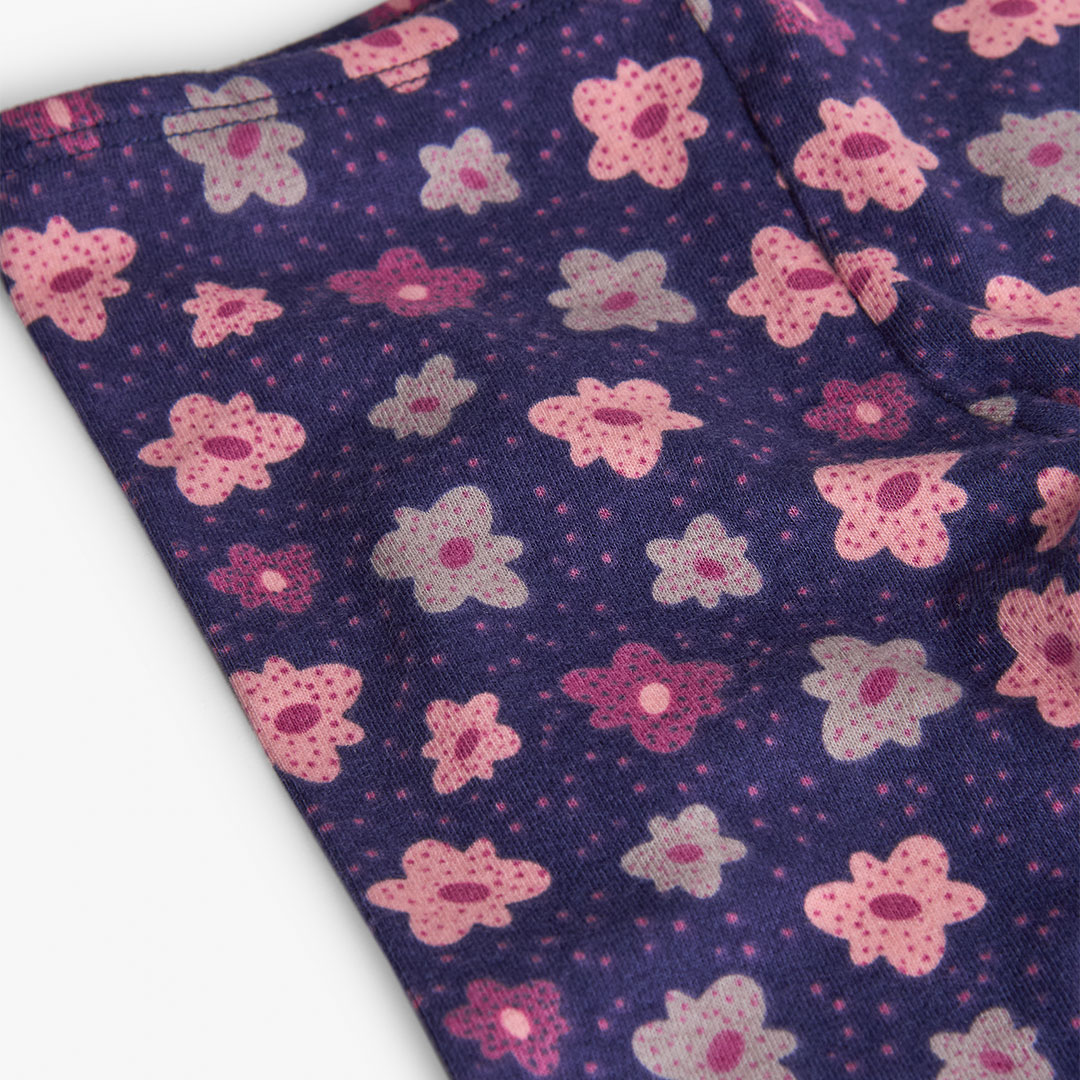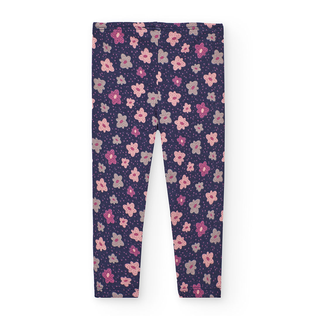 Leggings de menina confeccionados em malha de cor lilás com um encantador estampado de flores, ideais para as estações de outono e inverno. Fabricados num tecido elástico, asseguram conforto e liberdade de movimento para os mais pequenos. Disponíveis em tamanhos desde 12 meses até 10 anos, são perfeitos para combinar com camisetas e suéteres lisos, oferecendo um conjunto alegre e moderno para qualquer ocasião.