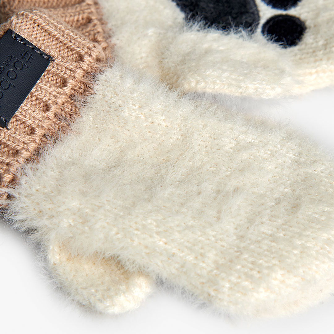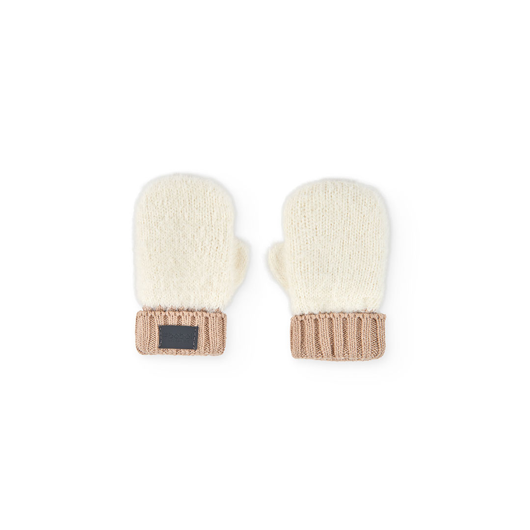 Luvas para bebé em cor branca e bege, desenhadas para manter as mãos do seu pequeno quentes e confortáveis durante as estações mais frias. Confeccionadas com um material suave e delicado, são ideais para a pele sensível dos bebés. O design com detalhes de animal adiciona um toque encantador e divertido. Disponíveis em tamanhos para bebés de 1 mês até 24 meses, estas luvas combinam facilmente com qualquer conjunto de inverno, sendo uma escolha prática e acolhedora para completar o guarda-roupa do seu bebé.