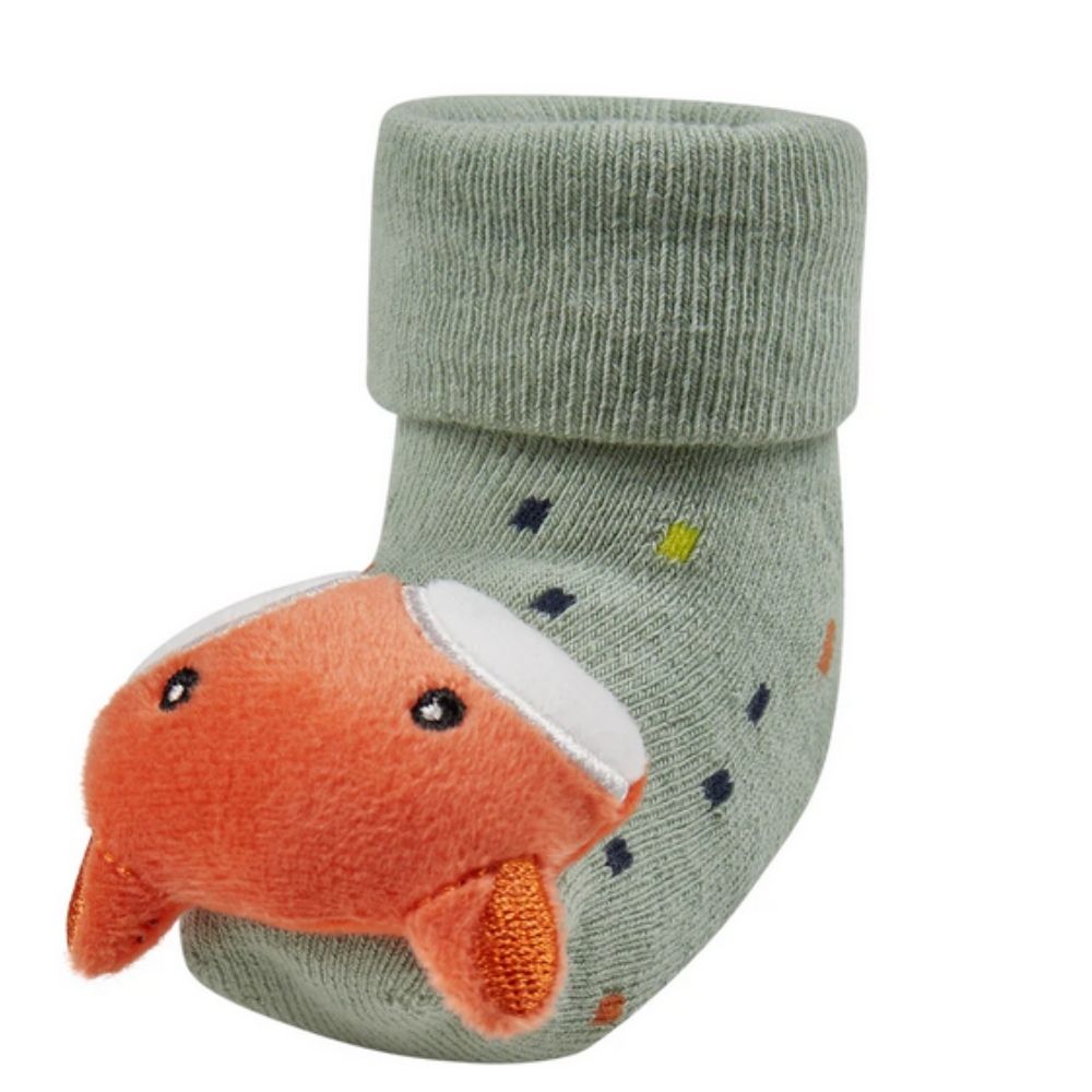Meias de bebé com punho, interior em turco e figura de raposa, com chocalho incorporado para as primeiras brincadeiras do bebé.