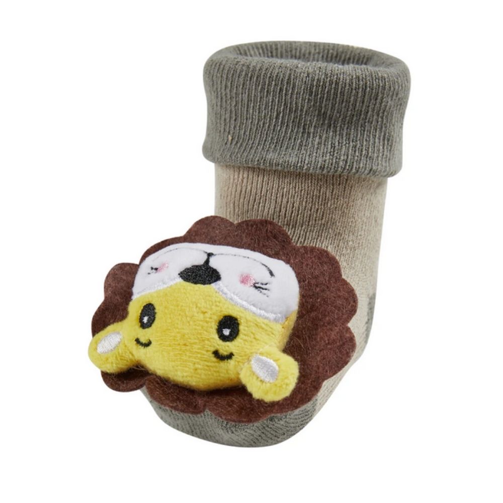 Meias de bebé com punho, interior em turco e figura de leão, com chocalho incorporado para as primeiras brincadeiras do bebé.
