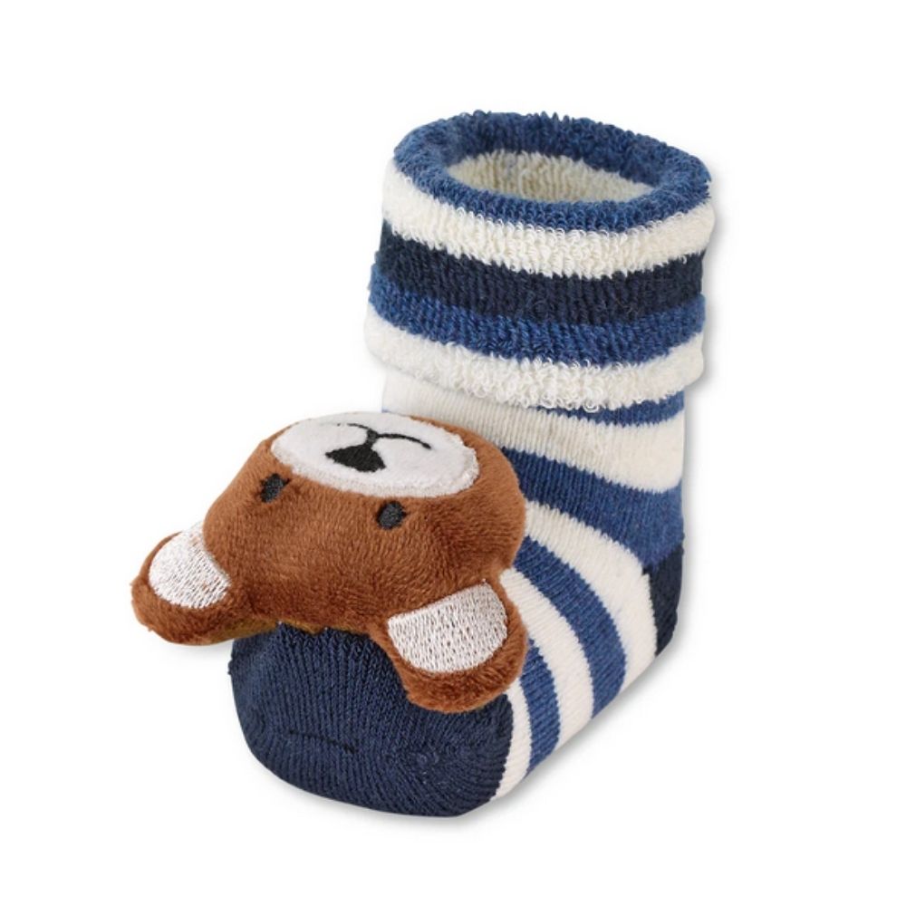 Meias de bebé com punho, interior em turco e figura de urso, com chocalho incorporado para as primeiras brincadeiras do bebé.