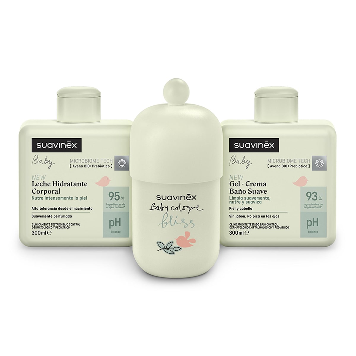 Inclui a delicada Baby Cologne Bliss 100 ml, uma colónia com baixo teor de álcool e aroma suave, concebida para ser aplicada na roupa; o Gel-Crema Banho Suave 300 ml, que limpa suavemente sem ressecar a pele graças à sua fórmula com extrato de aveia e ativos hidratantes; e o Leche Hidratante Corporal 300 ml, enriquecido com óleos e manteigas vegetais que nutrem e protegem a pele infantil.