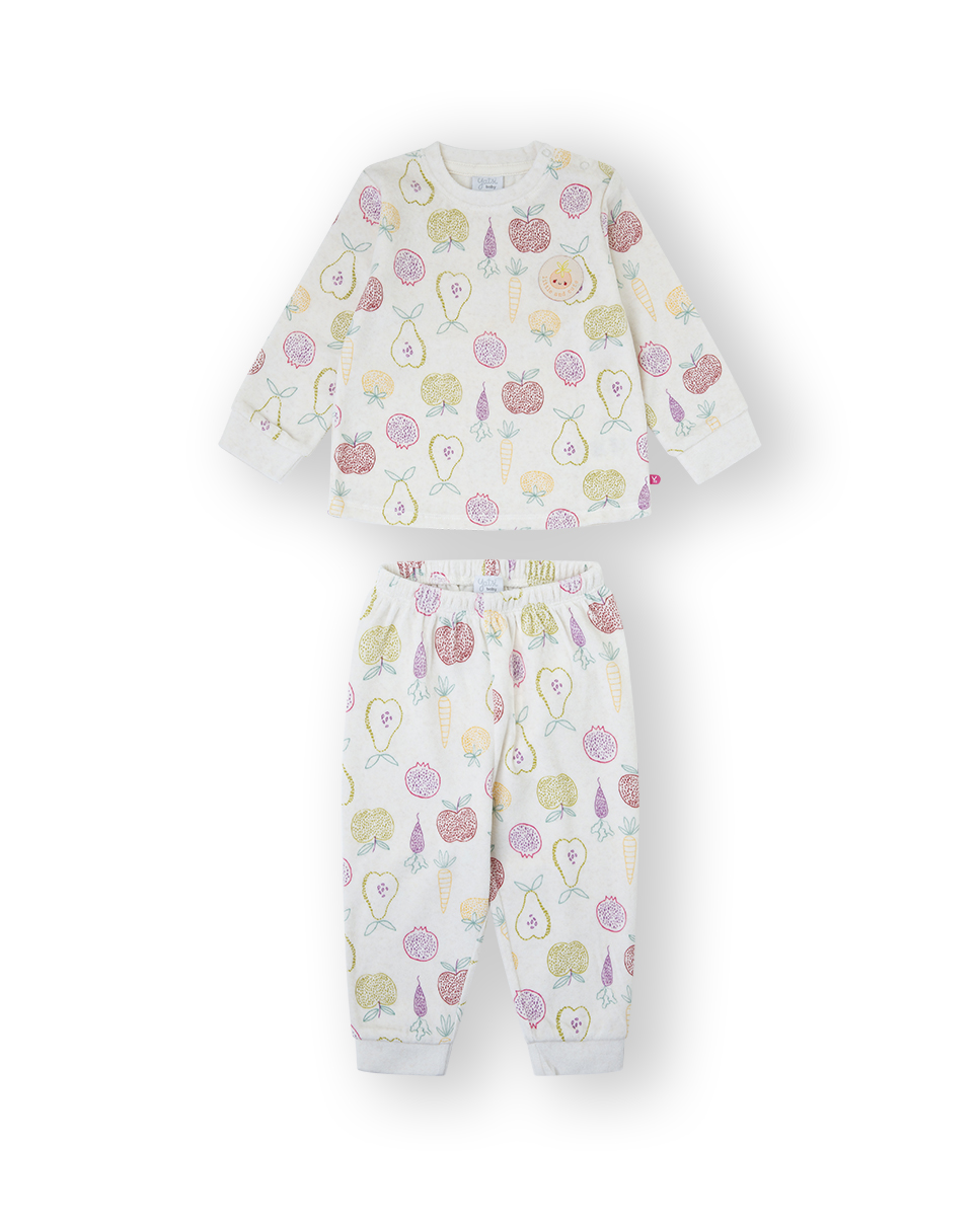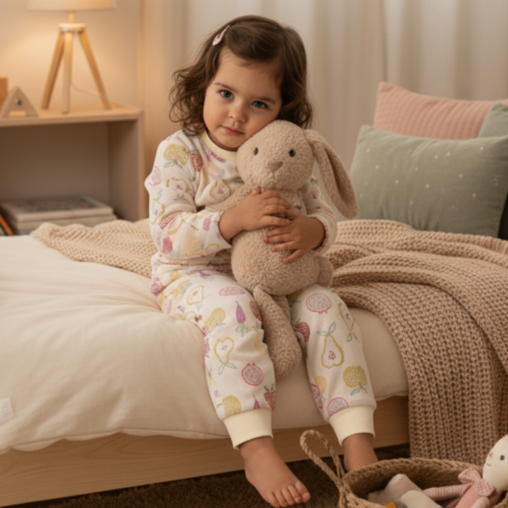 Pijama duas peças para menina, em algodão suave, com estampado em tons pastel e punhos canelados rosa para um ajuste confortável. Macio e respirável, perfeito para noites quentinhas e tranquilas.