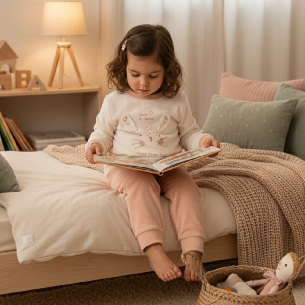 Pijama duas peças para menina, em algodão suave, com estampado em tons pastel e punhos canelados rosa para um ajuste confortável. Macio e respirável, perfeito para noites quentinhas e tranquilas.