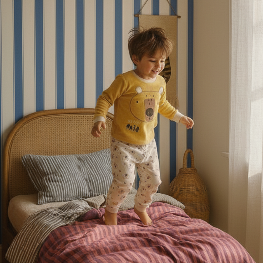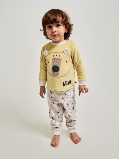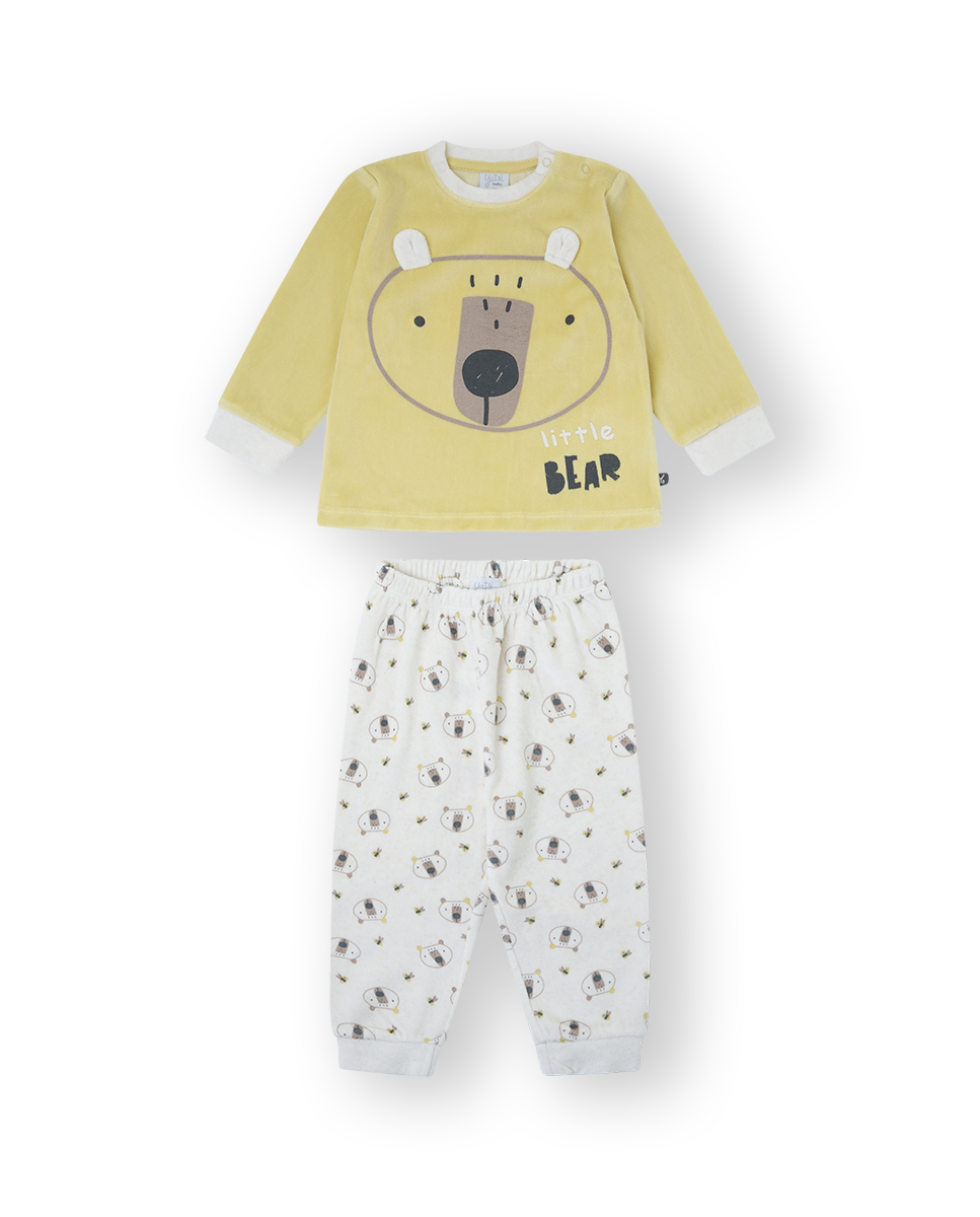 Pijama duas peças para menino, em algodão suave, com estampado em tons amarelo e punhos canelados para um ajuste confortável. Macio e respirável, perfeito para noites quentinhas e tranquilas.