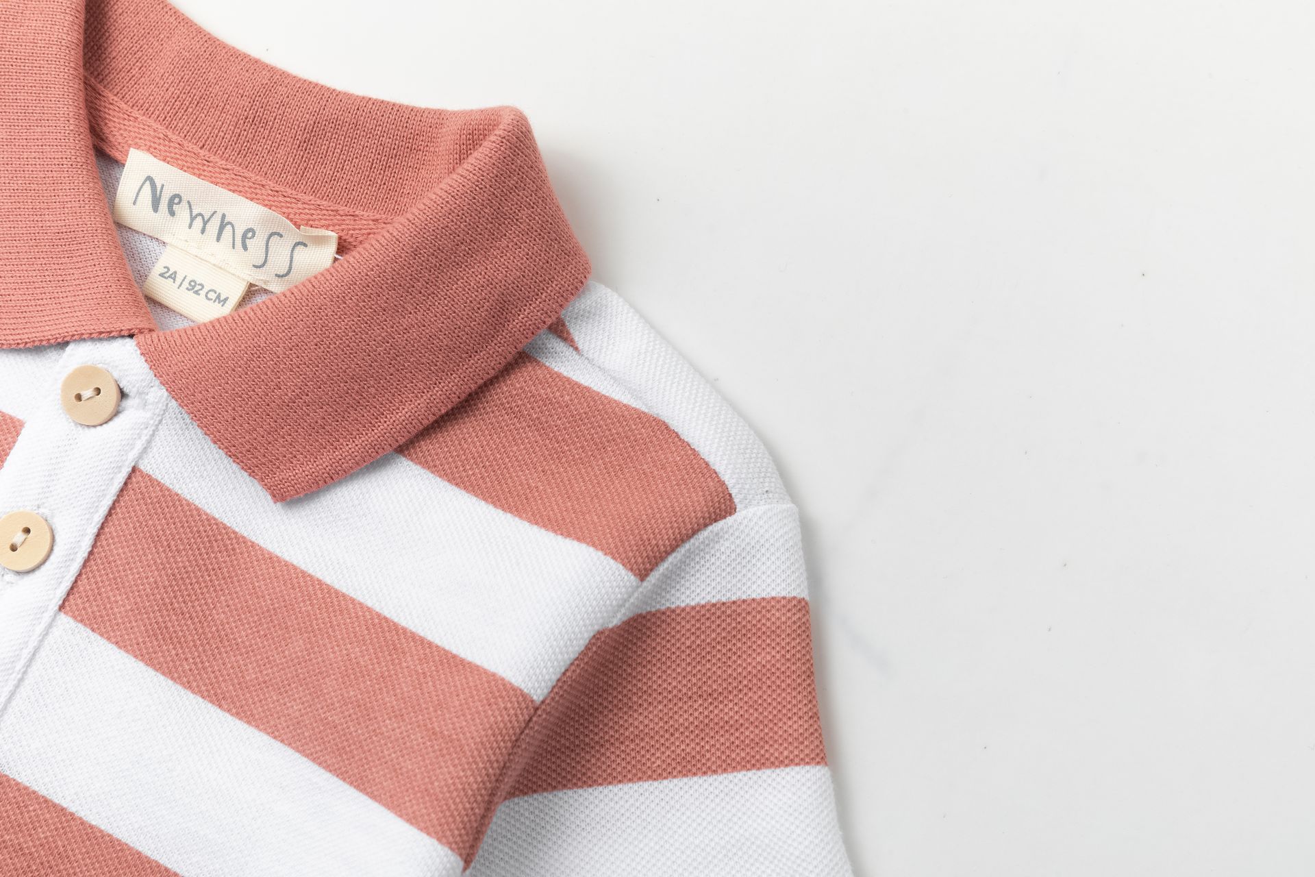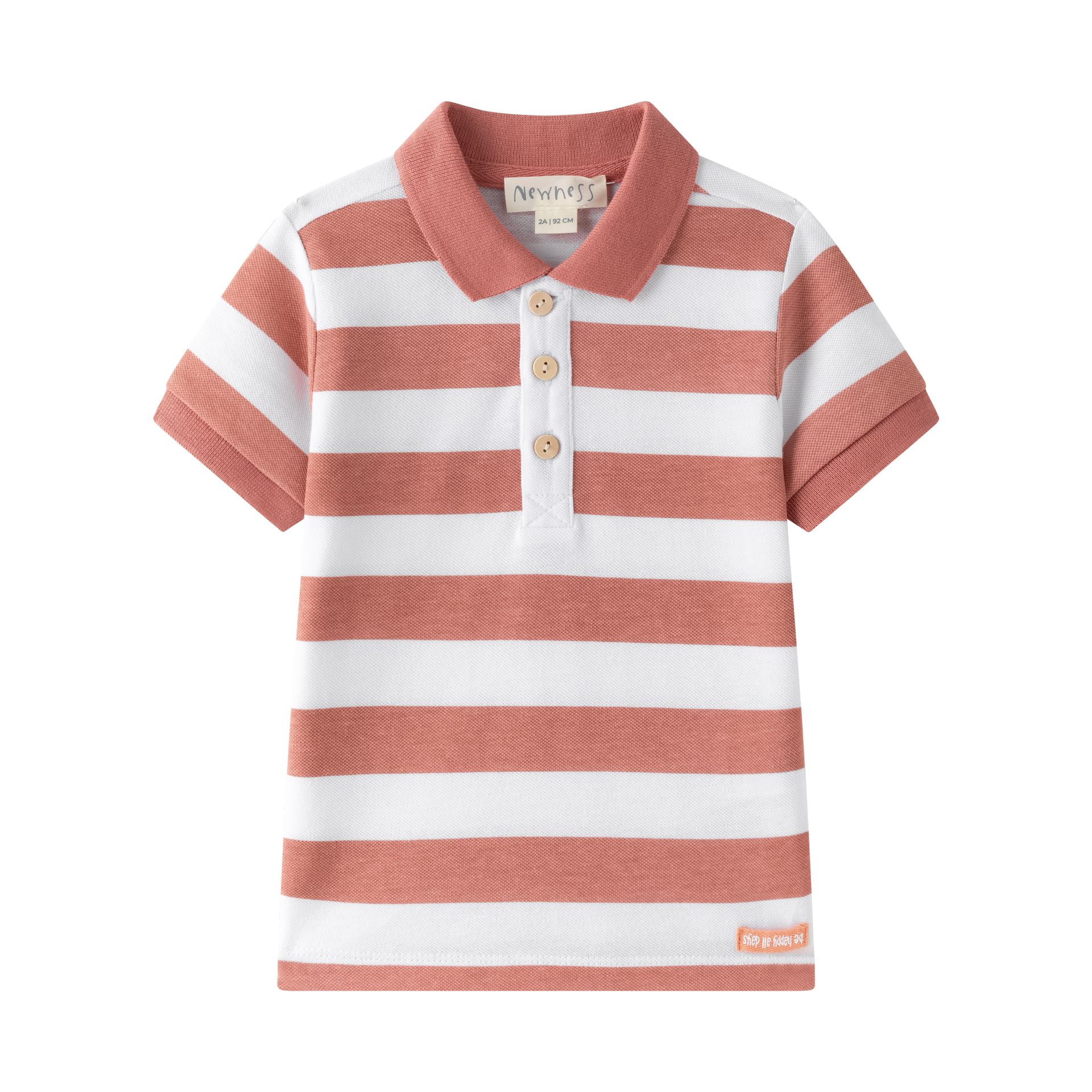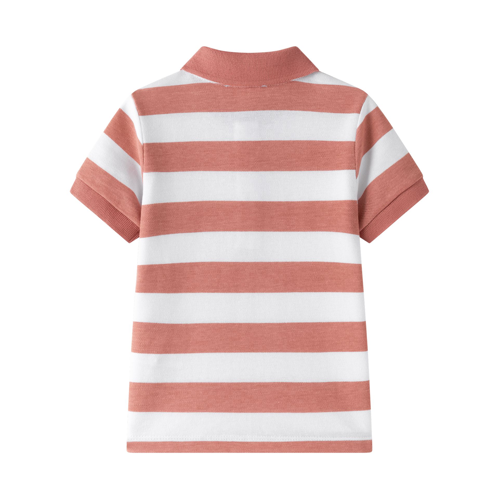 Polo de bebé/menino com riscas largas em terracota e branco, com gola polo e abertura com botões — aquele básico “arranjadinho” que funciona em todo o lado.