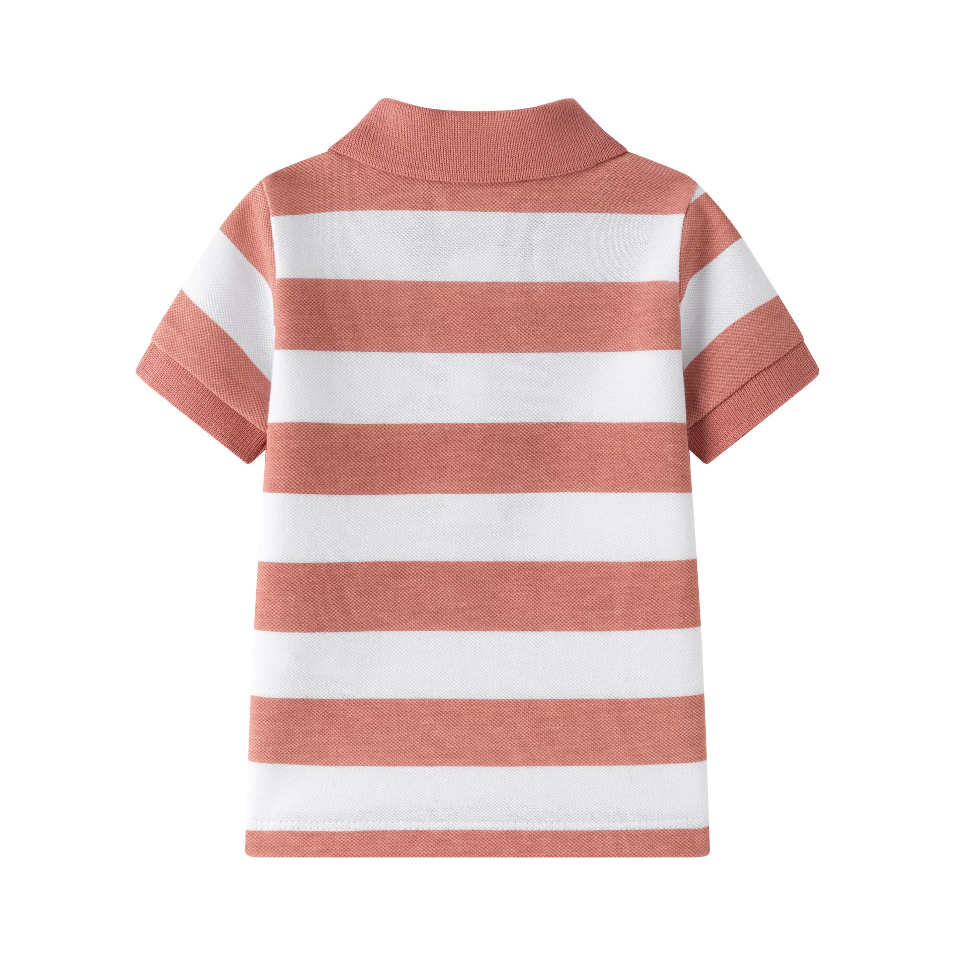 Polo de bebé em estilo clássico, com riscas largas em terracota e branco, gola polo e abertura com botões para vestir facilmente. O detalhe do patch bordado de leão dá um toque divertido e querido, sem perder o ar “arranjadinho”.