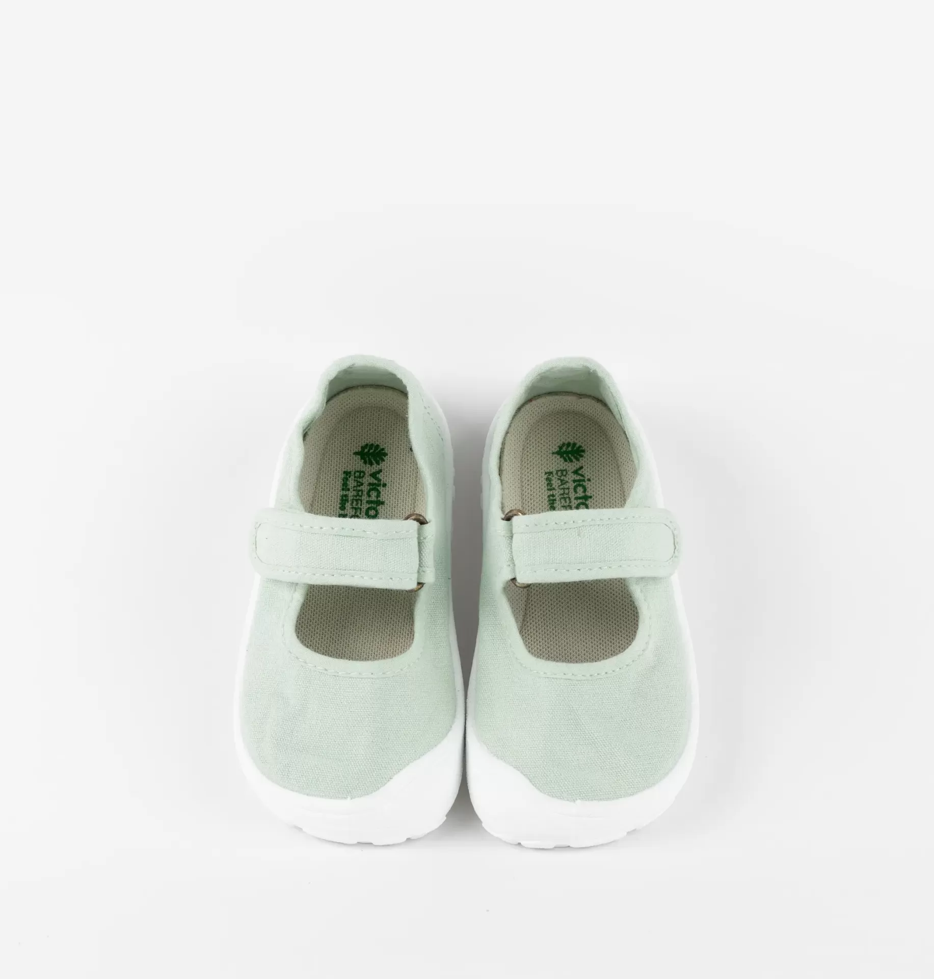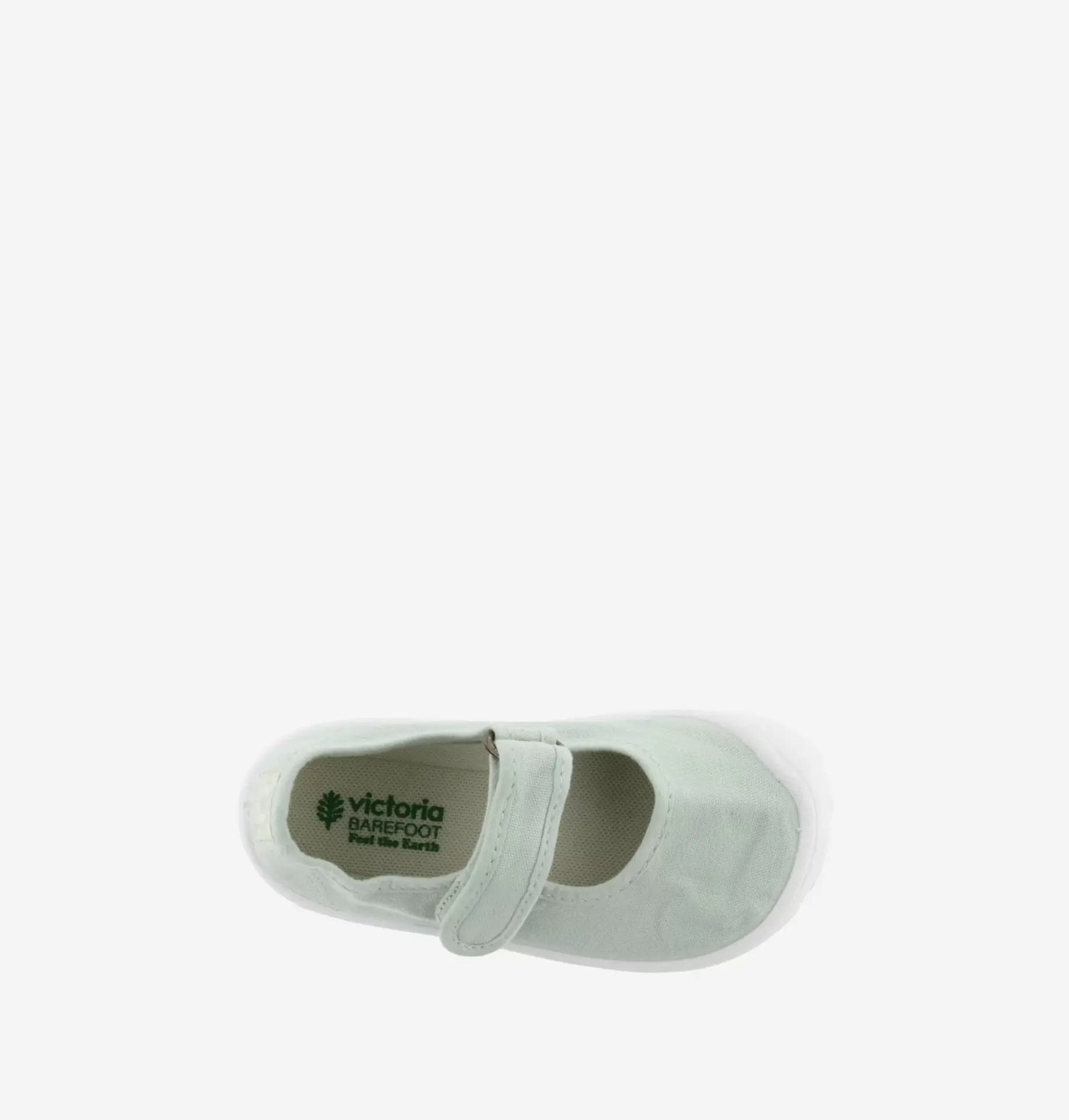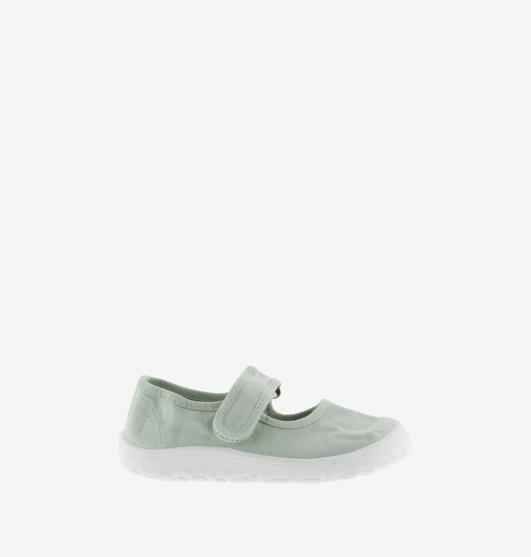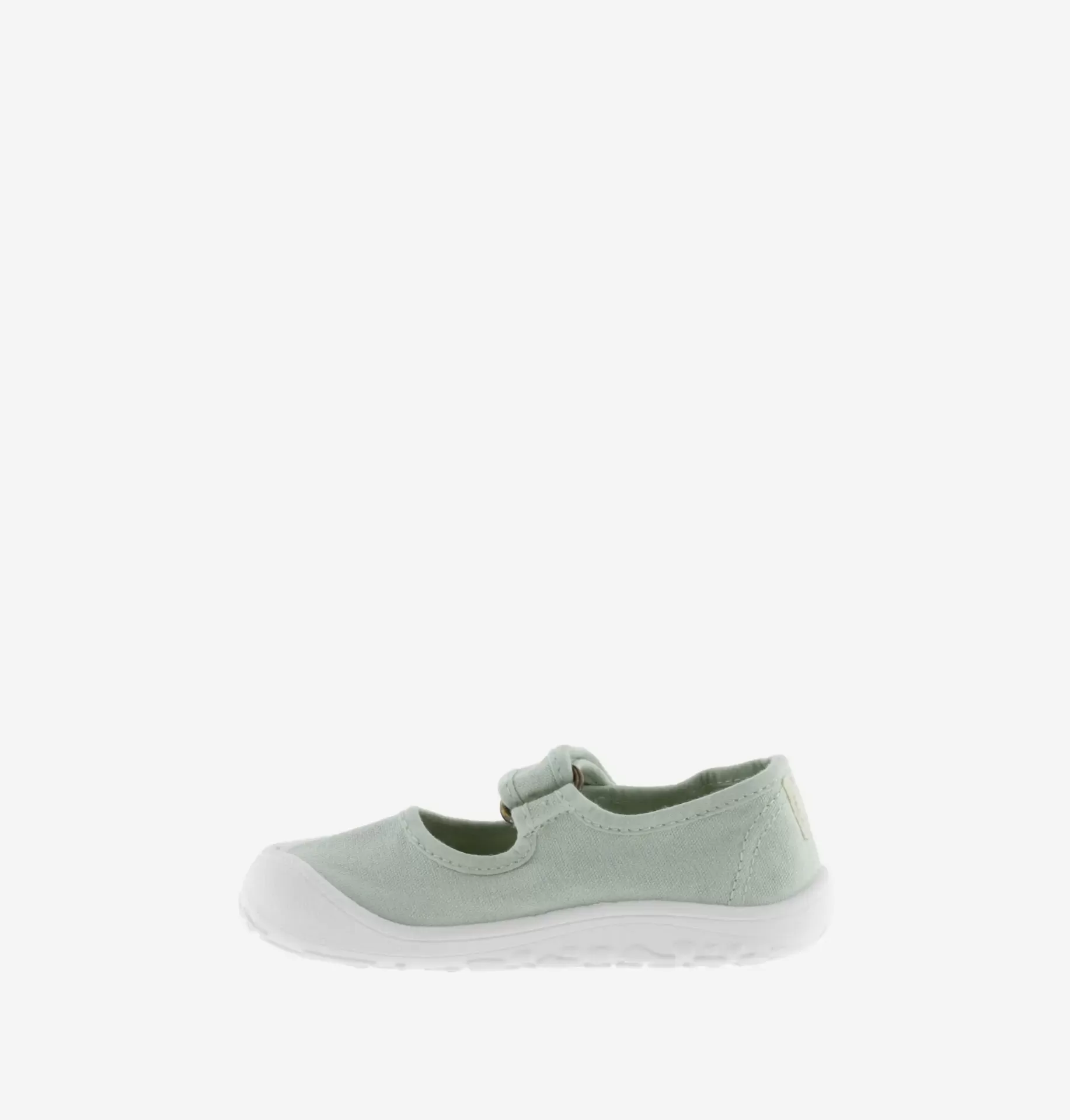 Merceditas respeitadoras barefoot em lona tingida DREC (Dyeable Recycled Eco Cotton). O fecho é feito com uma tira aderente, que facilita o calçar e promove a autonomia. Sola em TR flexível. Modelo sustentável Dear World. Fabricado em Espanha.